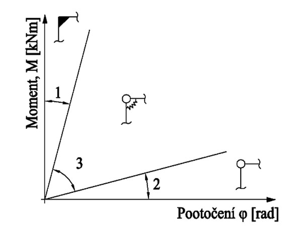 - styčníky sú rotačné pružiny s nulovou dĺžkou. Pri hodnote tuhosti pružiny sa musí počítať so zodpovedajúcim smerom momentu a zaťaženia.