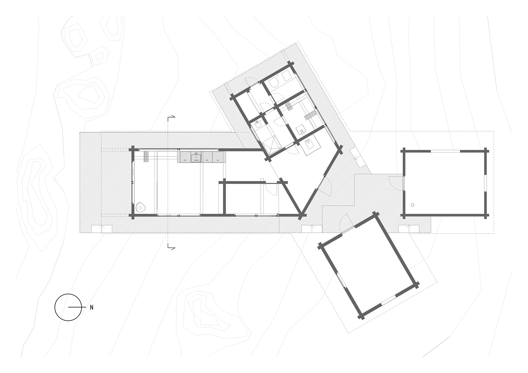 Prianím klienta bolo, aby sa pôvodné dva objekty zachovali a obohatili o potrebné základné funkcie. Keďže podlažná plocha oboch zrubov dohromady nepresahovala 30 m2, doplnila sa nová drevená stavba. Je opäť samostatne stojaca, ale zároveň súčasťou jedného celku. Moderná dostavba využíva rovnaký konštrukčný systém ako susediace objekty, čo je zaujímavé najmä z toho dôvodu, že jeden zo zrubov má vyše sto rokov. Jednoduchý až surový výraz stavebnej tradície sa pretransformoval a premietol do súčasnej doby v podobe čistých a nekomplikovaných detailov bez zbytočných dekorácií. Ako príklad možno uviesť rámy okien zalícované s nosnou stenou bez parapetu, čo je najhorúcejšia dizajnová novinka vo výrobe okien.