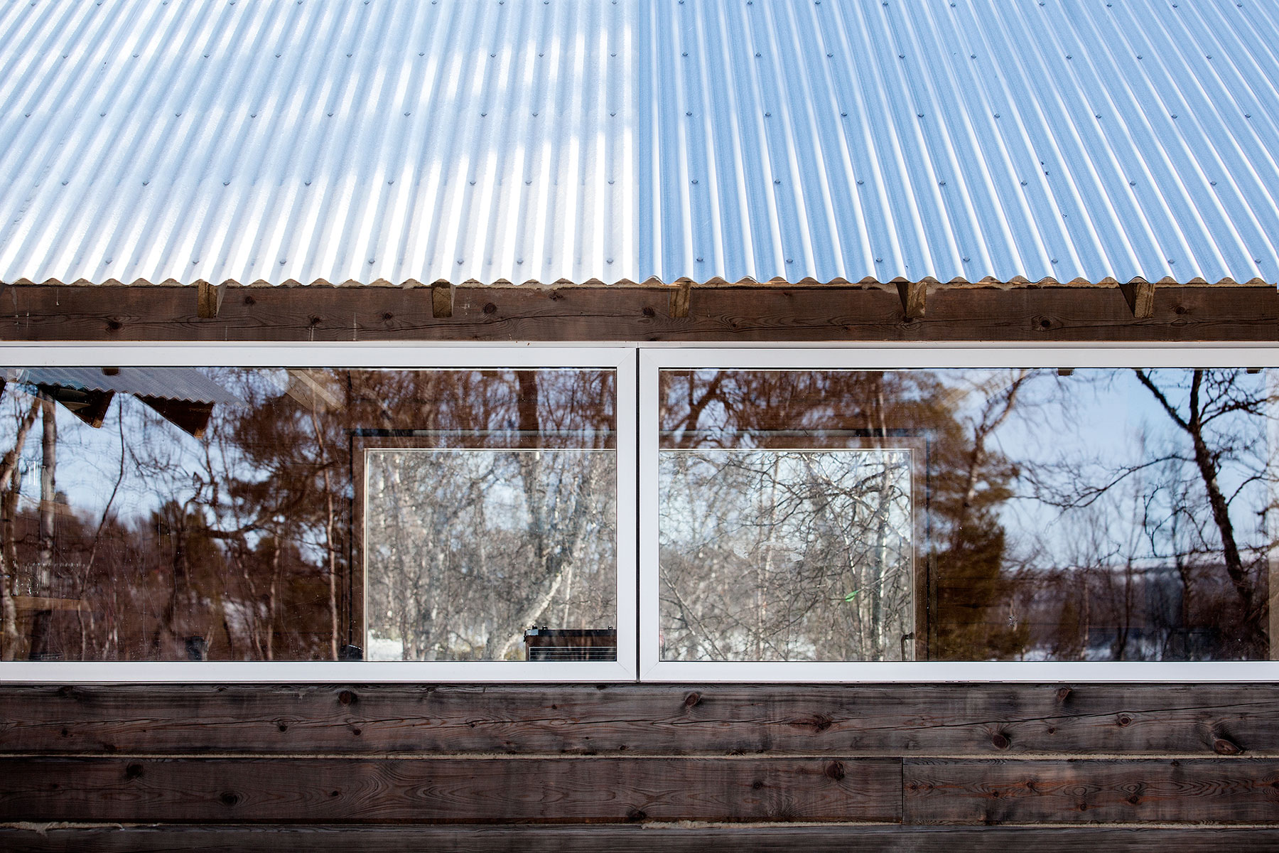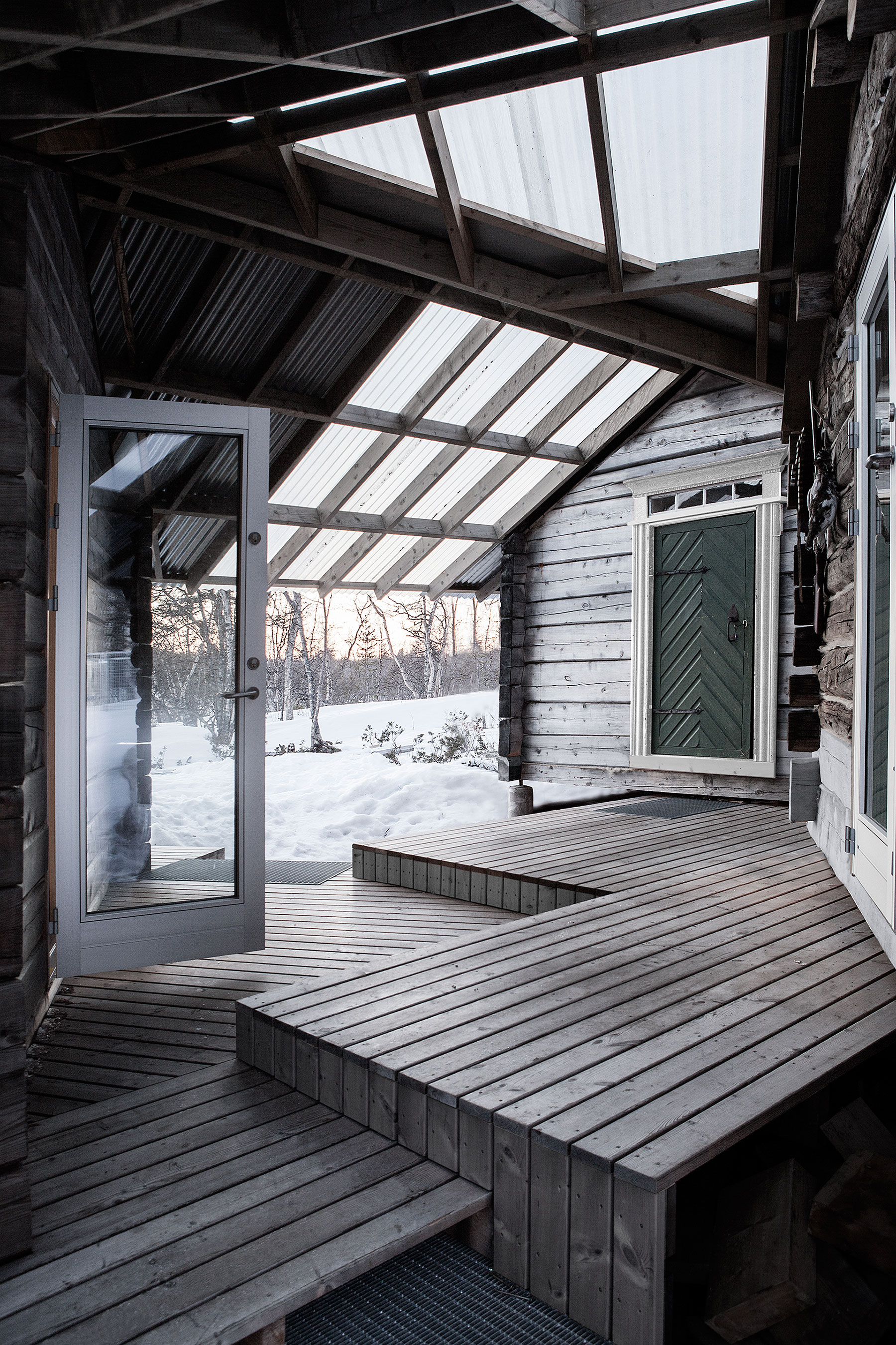 Zastrešenie tvoria striedavo plochy z vlnitého plechu a priesvitného vlnitého materiálu. Priesvitné časti presvetľujú plochu medzi objektmi aj interiér samotný a umožňujú prechod svetla i cez okná a dvere orientované do krytého priestoru. Pôvodné jednoizbové zruby sú spojené s hlavnou časťou len zastrešením, majú iba doplnkové využitie, slúžia ako hosťovská izba a miestnosť na skladovanie.