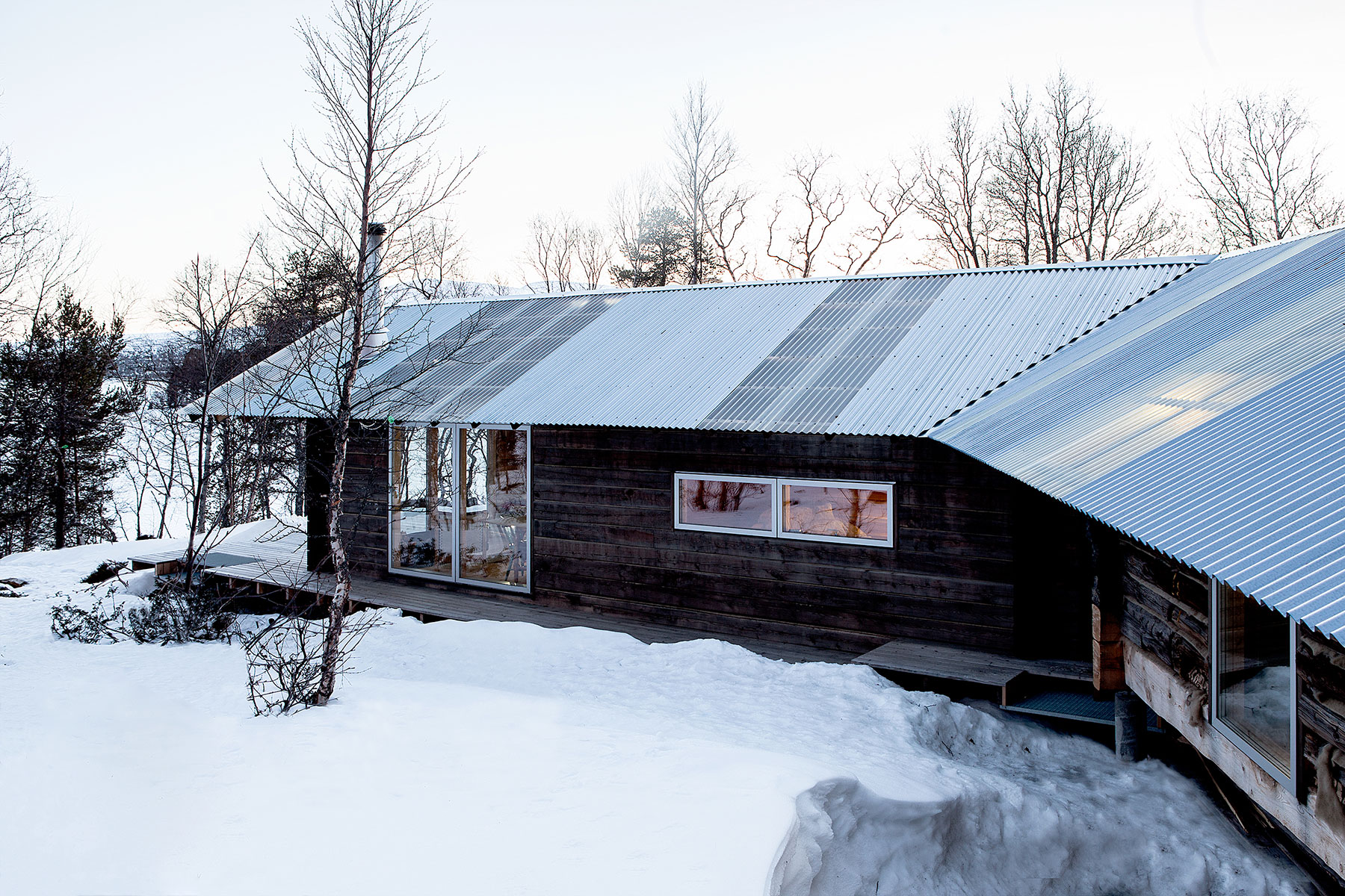 Krásne prostredie pri jazere Femunden poskytlo dôvod na obnovu dvoch pôvodných malých zrubov, ako aj na ďalšiu prístavbu. Nielen spoločné zastrešenie spojilo všetky tri časti dohromady – tri zruby zjednotil jeden jasný architektonický zámer.