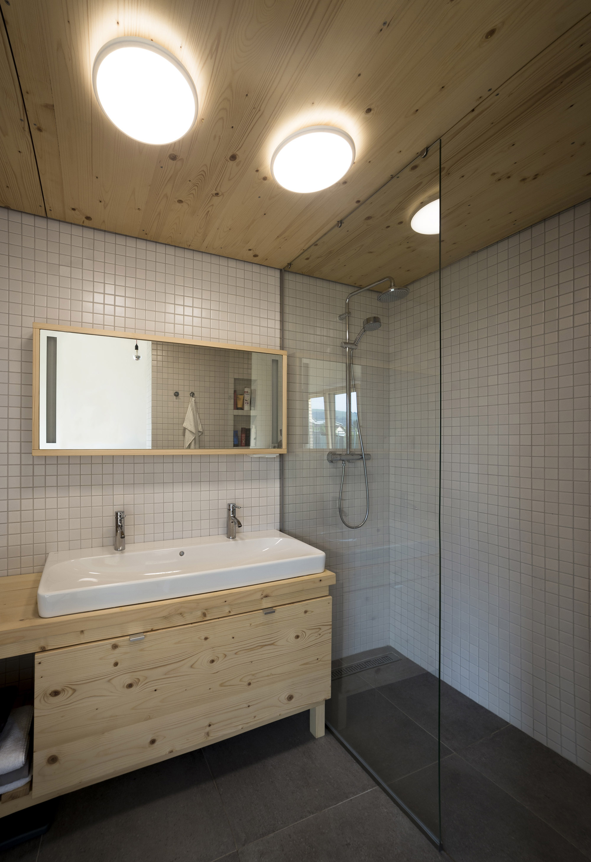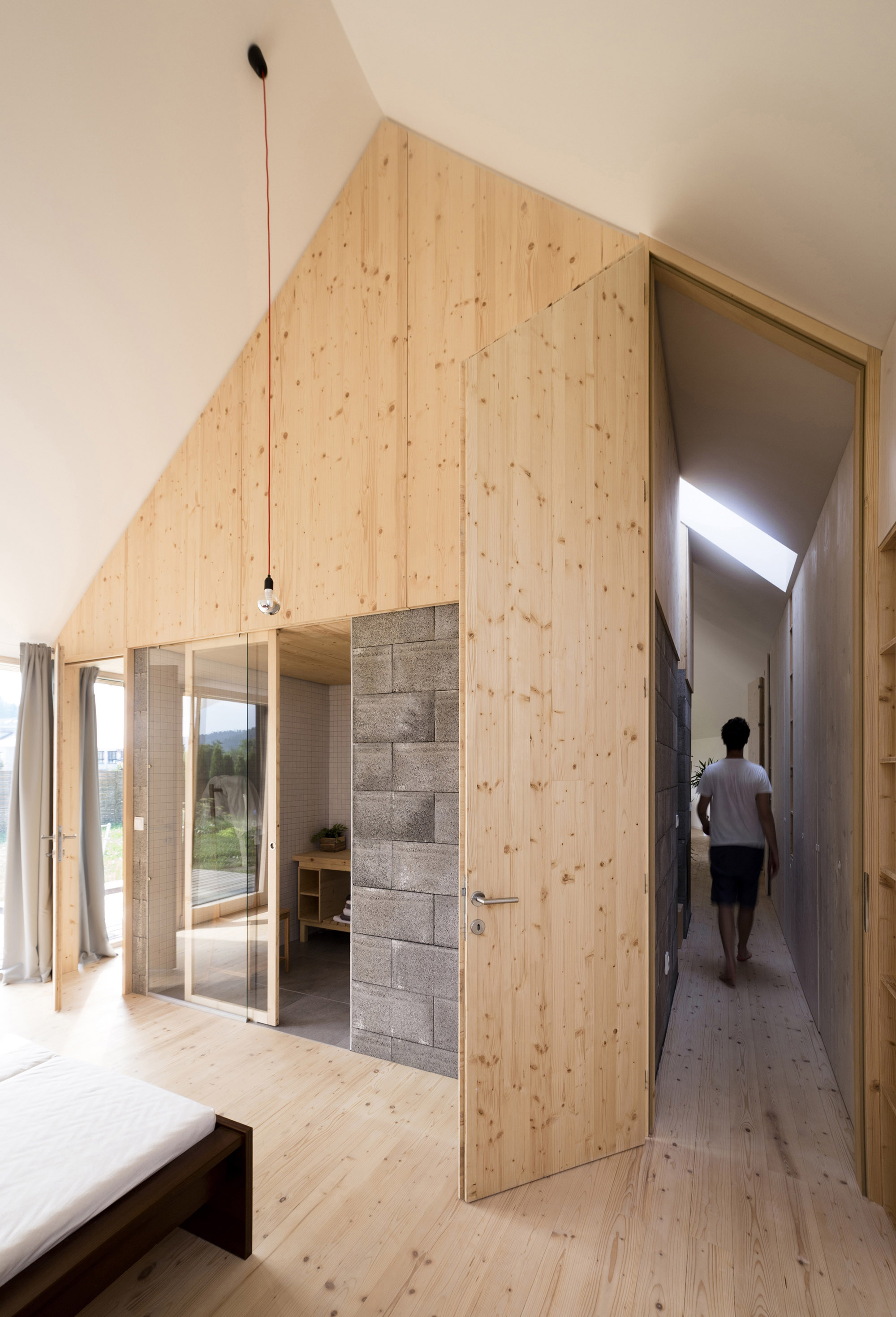 Výnimočný komfort v interiéri je dosiahnutý použitím výhradne masívnych drevených konštrukcií, povrchov a doplnkov zo smrekového dreva, ktoré je tradičným lokálnym materiálom. Smrek je použitý na priznaných konštrukciách, podlahe, rámoch okien a dverí, ako aj ich výplní, kuchynskej linke a 14 m dlhej vstavanej skrini, ktorá sa z centrálneho priestoru tiahne do rodičovskej izby. Surové betónové nosné steny sú príjemným kontrastom s použitých drevom.