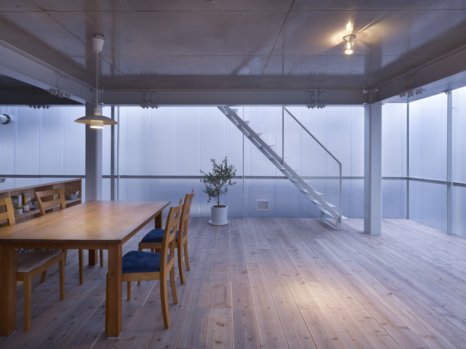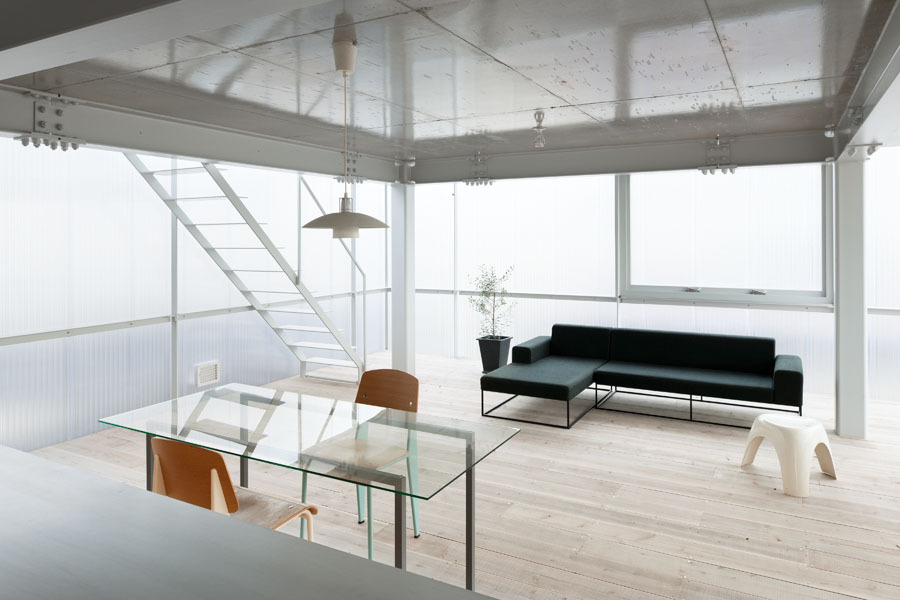 Myšlienka transparentného opláštenia umožňuje prienik slnečného žiarenia v čo najväčšej možnej miere. Dopĺňa ju otvorenie vnútornej priestorovej koncepcie. Otvorený priestor má rôzne využitia a je variabilný v závislosti od požiadaviek rodiny, meniacich sa časom. Dom je tak flexibilným miestom, typológia nie je obmedzená stenami ani oknami v obvodových stenách. Nosná konštrukcia je z ocele natretej nabielo. Dotvárajú ho betónové stropy a podlahy. V časti, ktorú by sme mohli nazvať obývacou izbou, je drevená podlaha, vďaka čomu sa priestor aspoň trochu zjemnil.