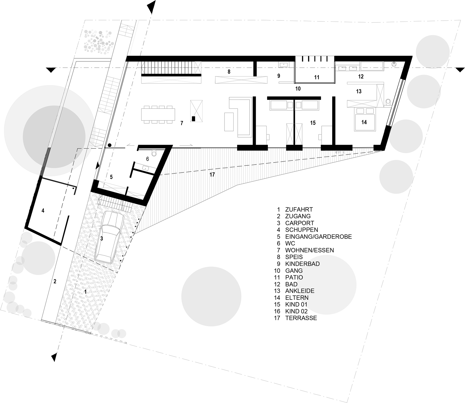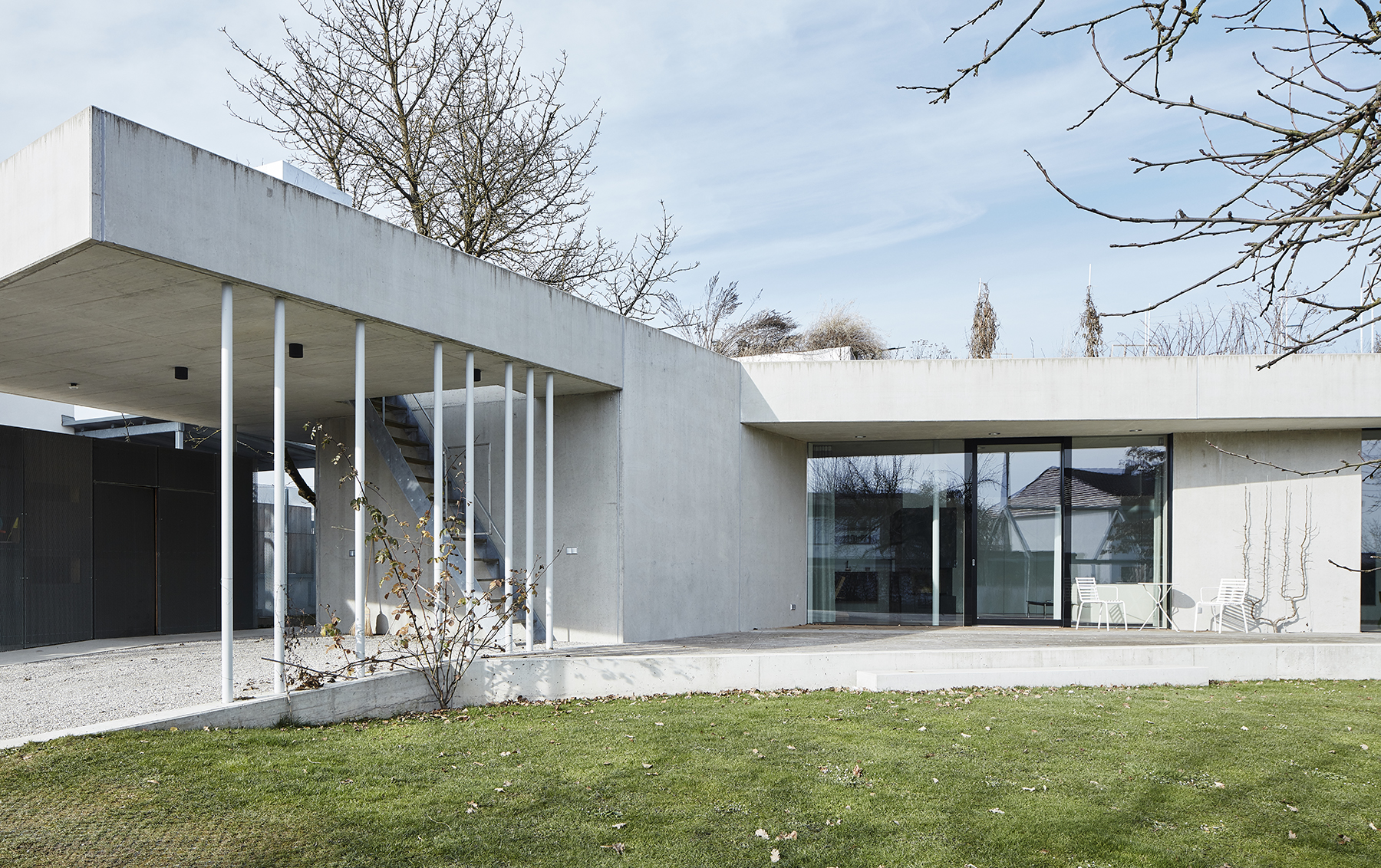 Pôdorys nenápadného domu vrátane parkovacieho státia má tvar mierne roztvoreného písmena L, čo umožňuje dostatok súkromia.