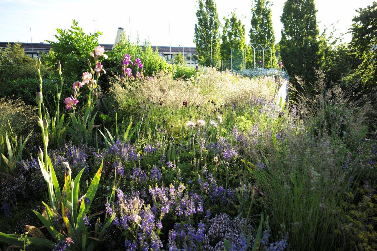 Zelený svet na streche je spojený so záhradou na pozemku vonkajším schodiskom. V záhrade sa nachádza aj „záhradný domček“, ktorý vytvoril umelec Sepp Auer ako multifunkčnú sochu.