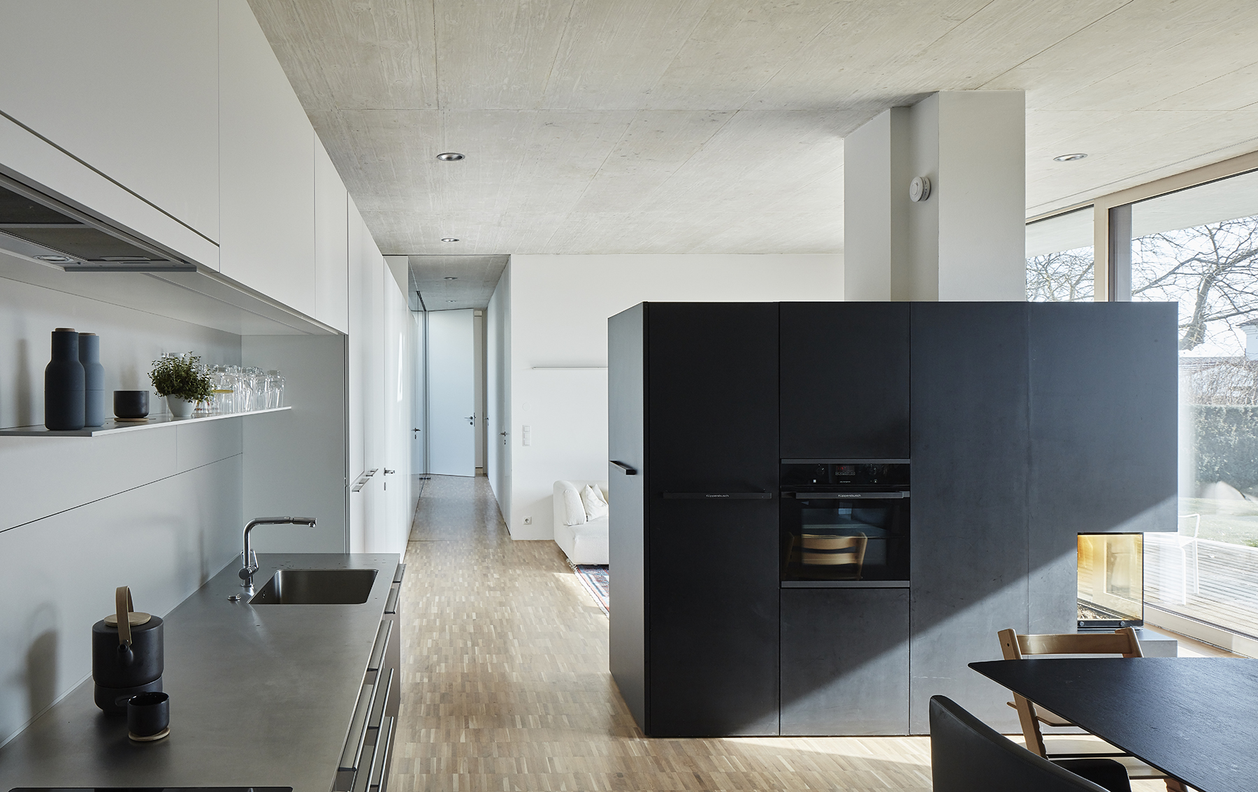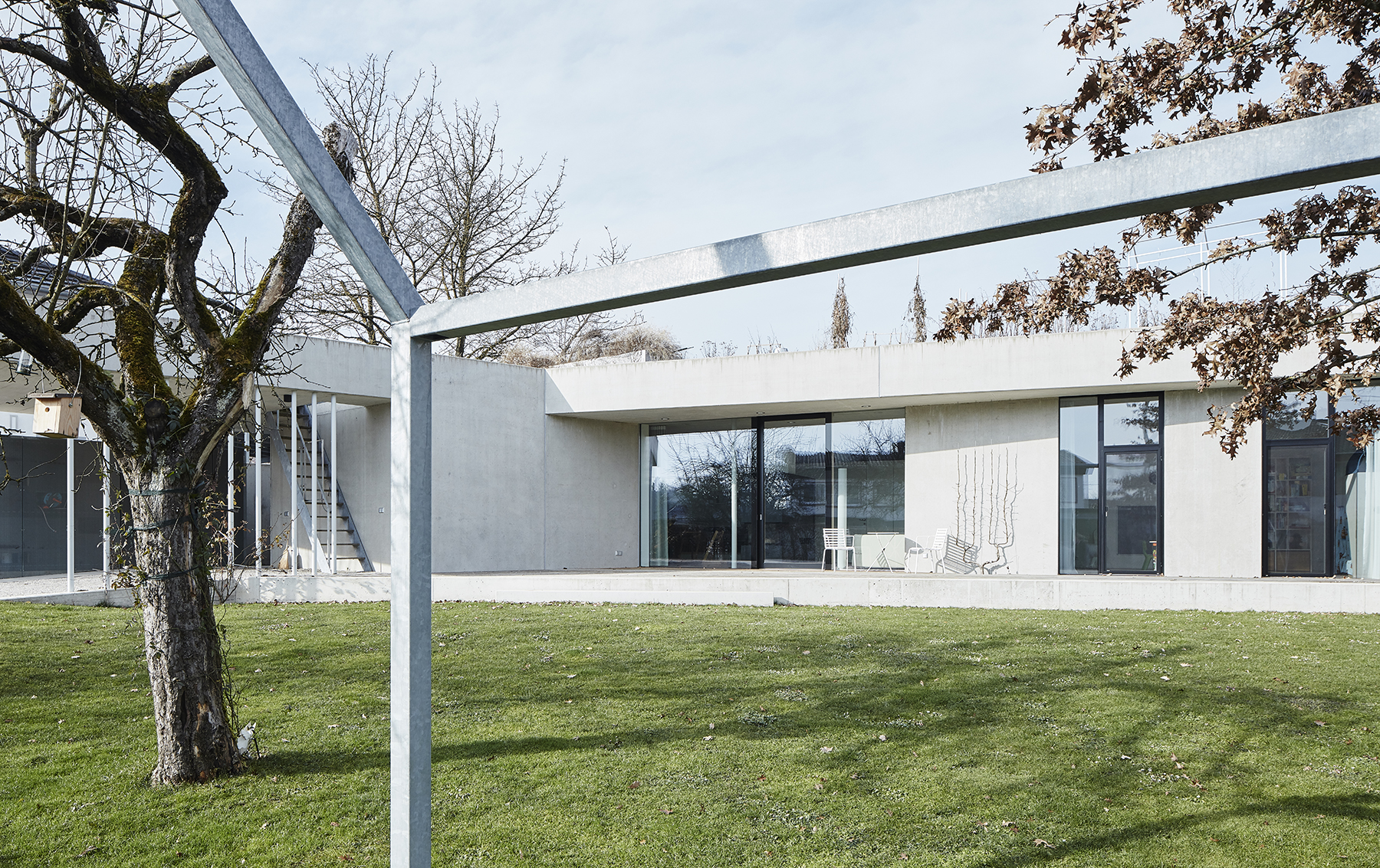 „Keby sme v tejto záhrade postavili bielu vilu, opticky by sme ju úplne potlačili. Pre nás bolo dôležité vytvoriť čo najužšie prepojenie záhrady a domu. Na železobetóne sme sa s klientom zhodli prakticky okamžite. Vznikla krásna kombinácia neutrálneho s prírodným,“ vysvetľuje architekt David Birgmann výber hlavného materiálu, ktorý určil všetko ostatné.