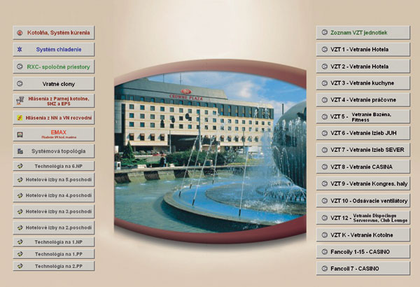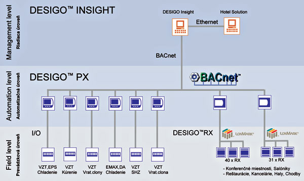 Prvý zabezpečuje riadenie všetkých technologických zariadení hotela prostredníctvom programovateľných riadiacich staníc, vďaka čomu sú ovládanie, regulácia a kontrola technických zariadení hotela maximálne flexibilné. Rozsiahle systémové funkcie ako alarmy, časové spínanie, pamäť údajov a trendov realizujú všetky požiadavky automatizácie z oblasti techniky budov. Na komunikáciu sa používa otvorený protokol BACnet spolu s protokolom LON, čím sa dosiahlo otvorenie systému.