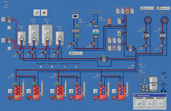 Systém merania a regulácie zabezpečuje optimálne a energeticky úsporné riadenie všetkých technológií vykurovania, chladenia a vetrania. Je rozdelený do dvoch vzájomne prepojených funkčných celkov.