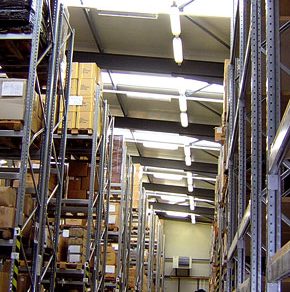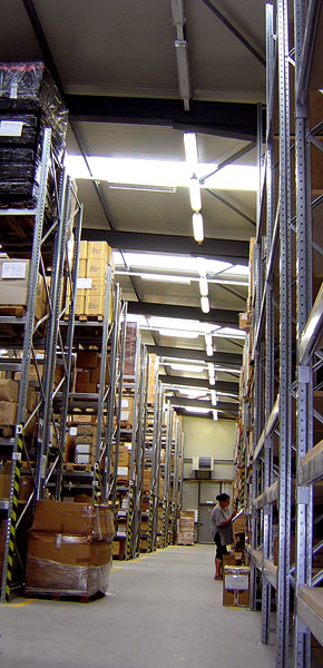 Svetelné zdroje – lineárne žiarivky T5 – prevádzkuje elektronický predradník. Spolu tvoria náplň svietidiel PEPS, ktoré sa použili na osvetlenie skladu, ale aj baliarne, nachádzajúcej sa vedľa skladu. Elektrické príkony použitých svietidiel sú rozdielne. Všetky komponenty DALI osvetľovacieho systému oboch miestností integruje smerovač, tzv. router, prostredníctvom dátovej zbernice (Dali 1 a Dali 2). Smerovač sa nainštaloval vo svetelnom rozvádzači (schéma zapojenia je na strane 60) spolu s ďalšími doplňujúcimi komponentmi. Senzory a ovládacie moduly sa nachádzajú v interiéri haly a skladu. Na základe svetelnotechnického návrhu sa svietidlá v sklade usporiadali do niekoľkých (A, B, C, D, E, F, G, H, I a J) skupín a upevnili sa vo výške 7 m.