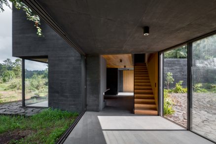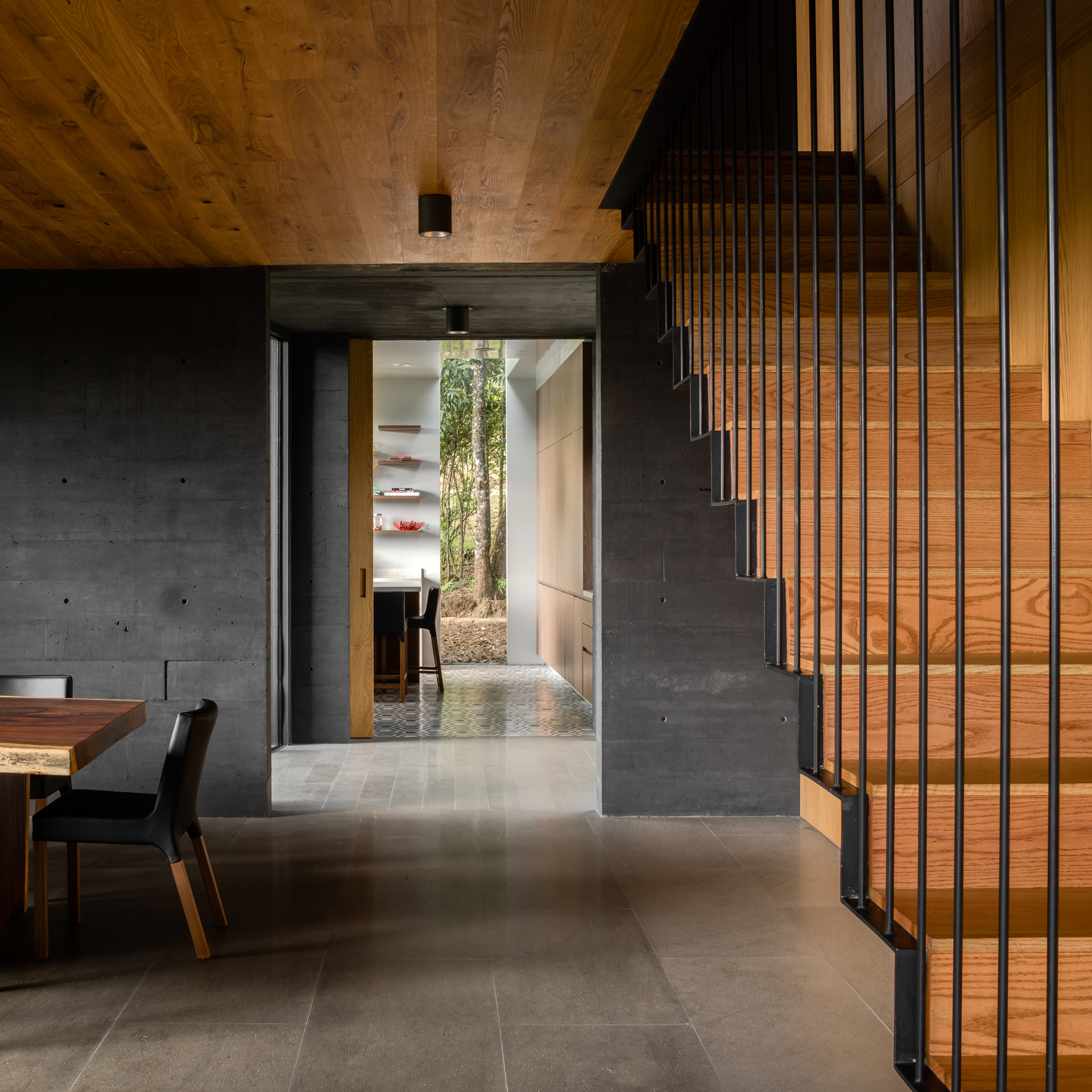 V celom dome bolo použitých iba päť materiálov: čierny betón, drevo, kameň, kov a sklo. Čiernu farbu, drsný kameň a prírodné materiály architekti vybrali preto, aby projekt pôsobil nadčasovo. Interiér je úplne zladený s exteriérom – hlavnými prvkami v ňom sú betón a drevo. Vstup do celého roztrúseného domu je na mieste, ktoré je najviditeľnejšie.