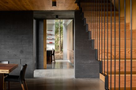 Na začiatku boli dve hlavné zásady: rešpektovať každý jeden strom, ktorý sa na pozemku nachádza, a dopriať každej časti domu dostatok prirodzeného svetla – ako ráno, tak aj popoludní. Tak vnikol okolo centrálnej terasy roztrúsený dom zložený zo samostatných objemov umiestnených s ohľadom na svetové strany, funkciu a existujúcu vegetáciu.