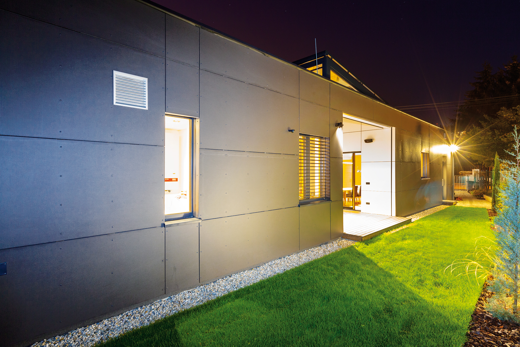 Kombináciou sivej a bielej farby veľkoformátového vláknocementového obkladu Equitone zdôraznil význam átria a zároveň vytvoril charakteristický prvok domu. Toto riešenie je zároveň reakciou architekta na stiesnené podmienky, ktoré diktoval charakter pozemku.
