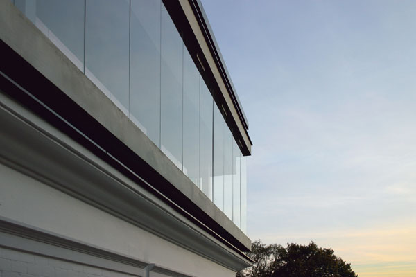 | Detail interpretácie rímsových profilov starej vily na novej nadstavbe. Zaujímavá je kombinácia svetlého a tmavého betónu. | Cez zasklené nárožie obývačky je výhľad na Labe s rušným waltershofským kontajnerovým terminálom. |