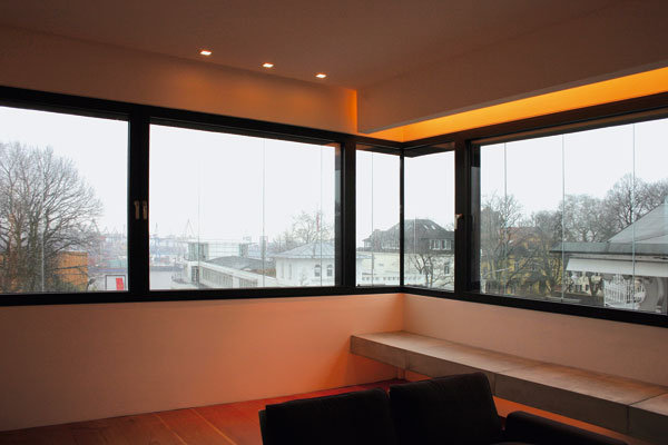 Svetlo vytvára na podklade rovných línií decentný kontrast, ktorý chcel architekt udržať, a nie prehĺbiť či potlačiť. Preto obmedzil farebnú škálu na úsečku od bielej cez sivú až po čiernu a zrejme z toho istého dôvodu hojne využíva aj pohľadový betón. V tomto byte z neho navrhol mimoriadne výrazný prvok jedálensko-obývacej časti hlavného priestoru – dlhé prístenné lavice, akoby stredoveké sedílie. V prostredí rôznorodých matných plôch – od betónu a bielych stien cez zaujímavú, neobyčajne rustikálnu duglaskovú podlahu až po pieskované sklené tabule – však v hamburskej nadstavbe hrá jednoznačný prím svetlo, priestor a výhľady.