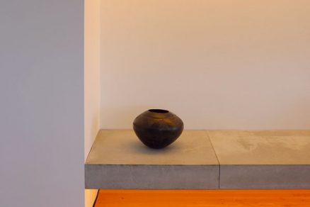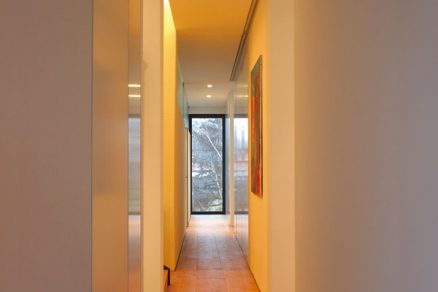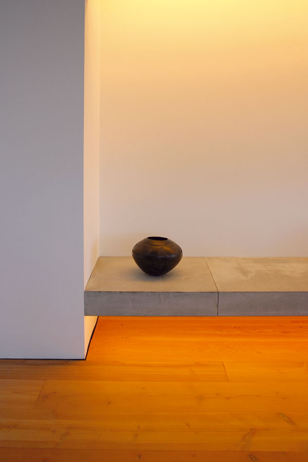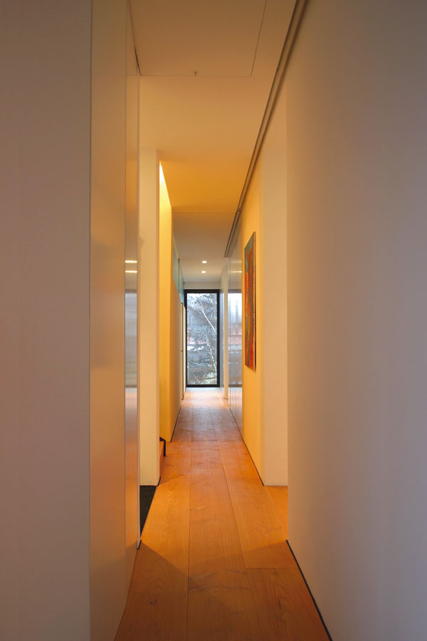 | Chodba je hlavnou osou bytu. Na jej konci vidieť čiastočne zasklenú stenu spálne a východ na zadnú terasu. | Podsvietená betónová lavica je výrazným prvkom obývacieho priestoru. Nieberg často používa pohľadový betón a mimoriadne dbá na jeho farebný odtieň. |