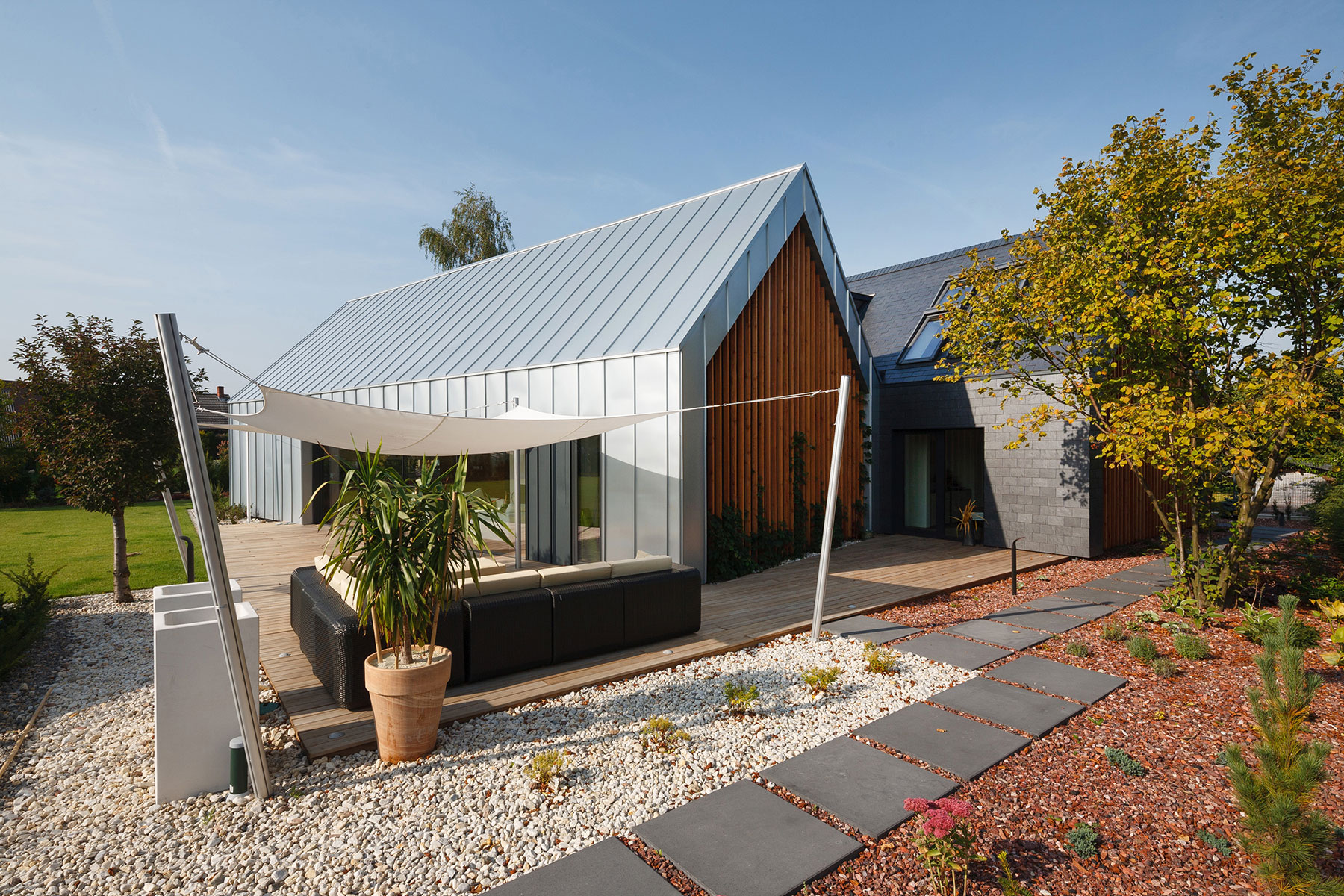 Požiadavkou investora bolo, aby sa dom otváral do južnej záhrady, pri zachovaní priestrannosti a komfortu. Aby to architekti dosiahli, rozdelili dom na dve materiálové a funkčne odlišné zóny. Prvú hmotu domu, do ktorej situovali dennú časť, otočili na juh.