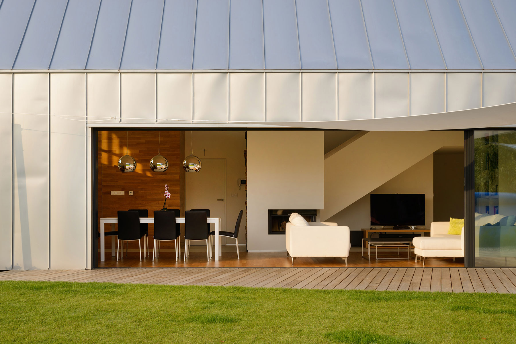 Obidve hmoty domu sú navzájom prepojené svetlým, otvoreným a zaskleným mezanínom.