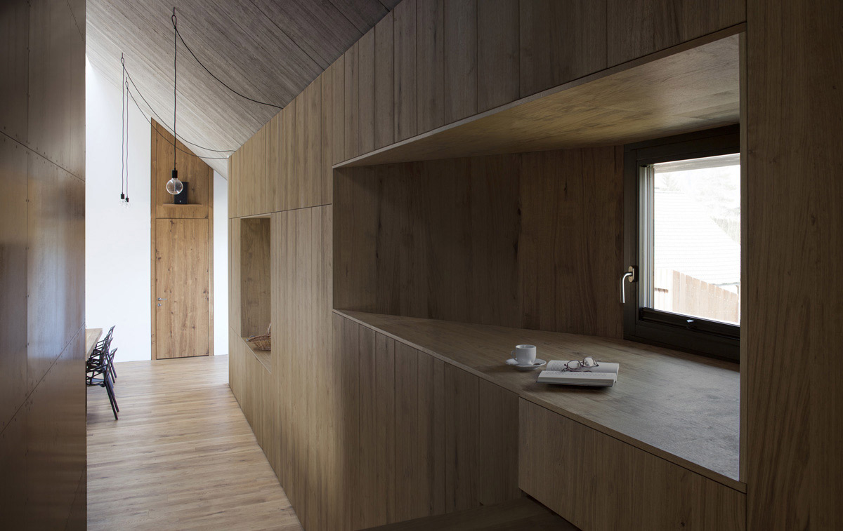 Vo vnútri nájdeme takmer výhradne drevo – dub. Zaujímavým prvkom je prekrytie všetkých zbytočných detailov obložením, napríklad aj okenných rámov. Pôsobí to v konečnom dôsledku omnoho čistejšie a nerušivo.