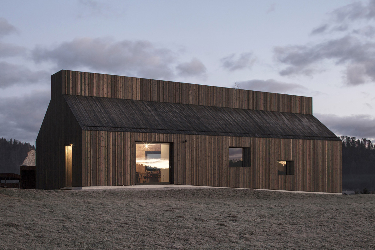 Konštrukcia domu už na prvý pohľad rešpektuje pravidlá miestnej architektúry – odkazuje na istý typ sedlovej strechy, pričom rešpektuje objemové a materiálové parametre okolitých stavieb. Dom, obložený naolejovanými smrekovcovými doskami, zapadá do prostredia na okraji obce, kúsok od kostola zo šestnásteho storočia. Vzhľadom pripomína okolité drevené stodoly a predstavuje zaujímavý dialóg medzi nimi a historickým kostolom.