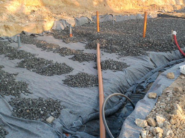 Na rad prichádza zasypávanie toho, čo sme vykopali. Nie však štrkom, ani zeminou, ani ničím podobným. Na zásyp sme použili funkčné „kamenivo“ z penového skla. Spĺňa drenážnu aj tepelnoizolačnú funkciu zároveň. Na Slovensku je to pomerne nový materiál. Aj toto je však len renesancia.