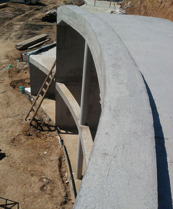 Predný oblúk sa musel viackrát kontrolovať, aby všetko neskôr sedelo. Vďaka stĺpom sa dal osadiť dosť presne podľa už zrealizovaného základu. Vylievanie betónu do hladkého debnenia má svoje výhody. Stĺpy nepotrebujú omietnuť, vyšli krásne hladké.