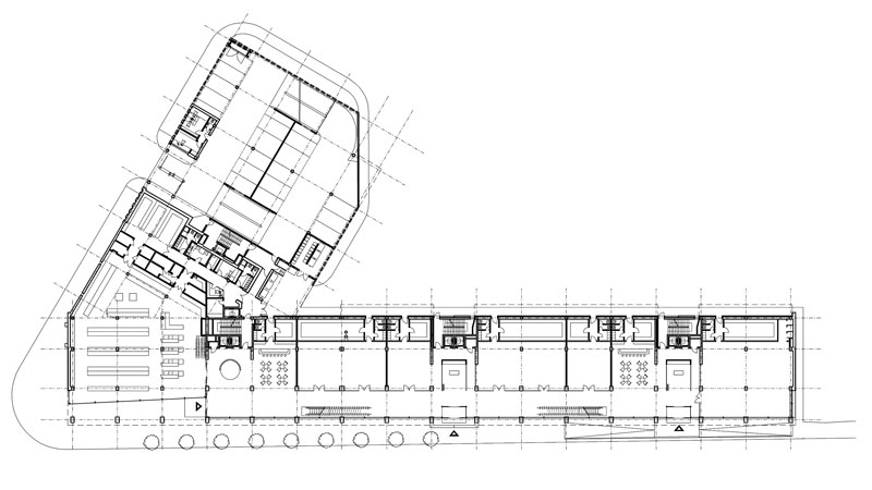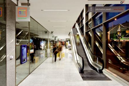 Na 1. a 2. podlaží sú obchodné priestory s presklenou pasážou orientovanou do ulice, ktorá tvorí predpolie vstupu do nich. Cez tento monumentálny výklad sa otvorilo vnútro budovy a život v nej sa iluzívne prelína aj do parteru mimo tela stavby. Pohyb vo vnútri tohto verejného priestoru sa lineárne usmerňuje zvonka veľmi nápadnými eskalátormi.