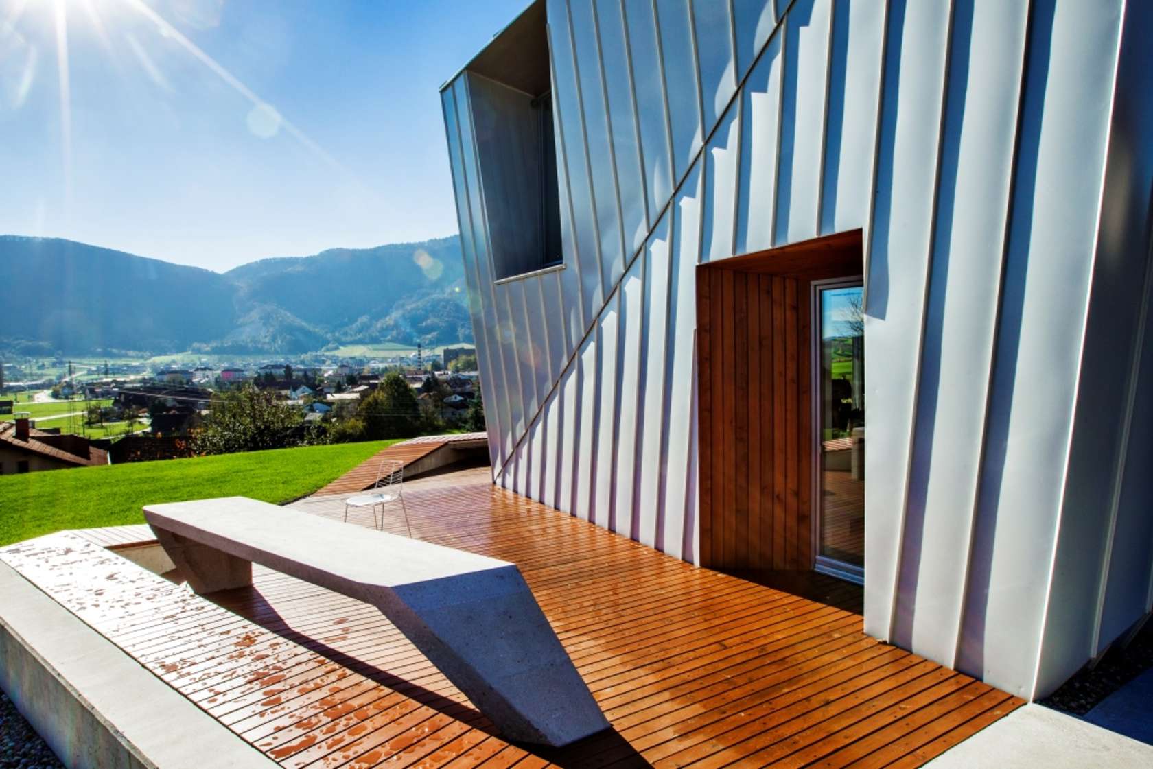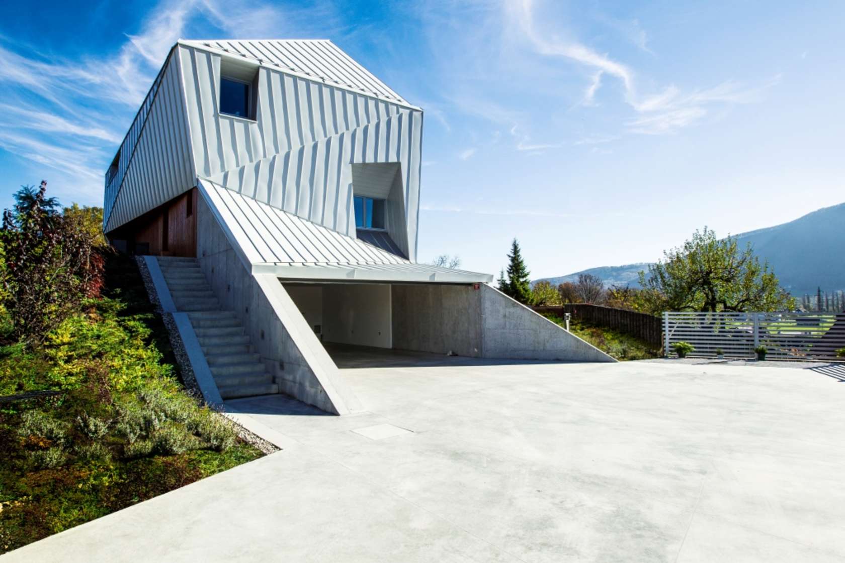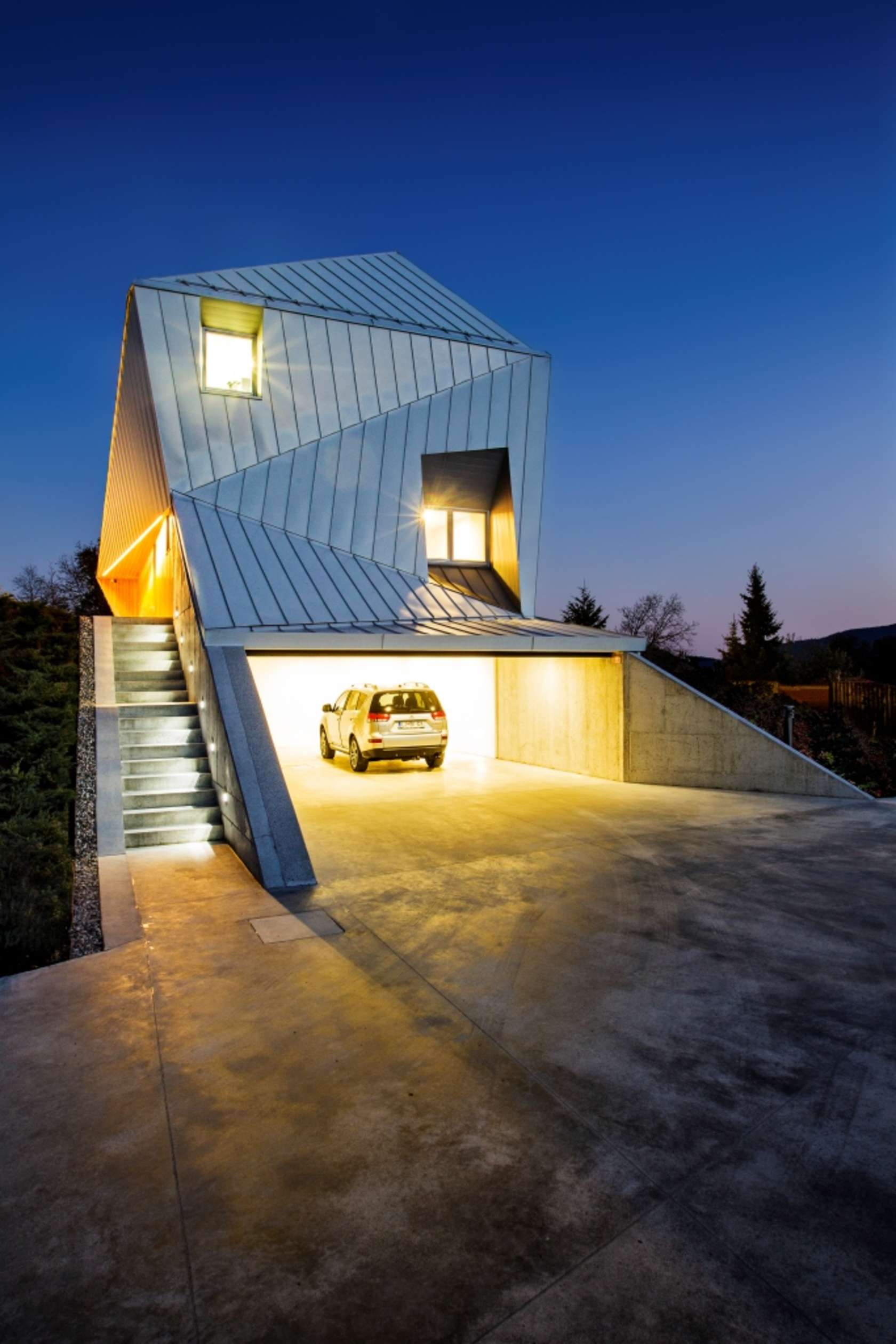 Experimentálny dizajn rodinného domu vytvorili architekti zo slovinského ateliéru Scapelab, ktorý pôsobí nielen moderne, ale vďaka starostlivo navrhnutému tvaru má aj funkčný význam. Zošikmené plochy sú vytvorené tak, aby v horúcich letných dňoch, keď je slnko vysoko na oblohe, bránili prieniku svetla cez okná. Naopak, v zime slnko preniká do interiéru, pasívne ho vyhrieva a presvetľuje.
