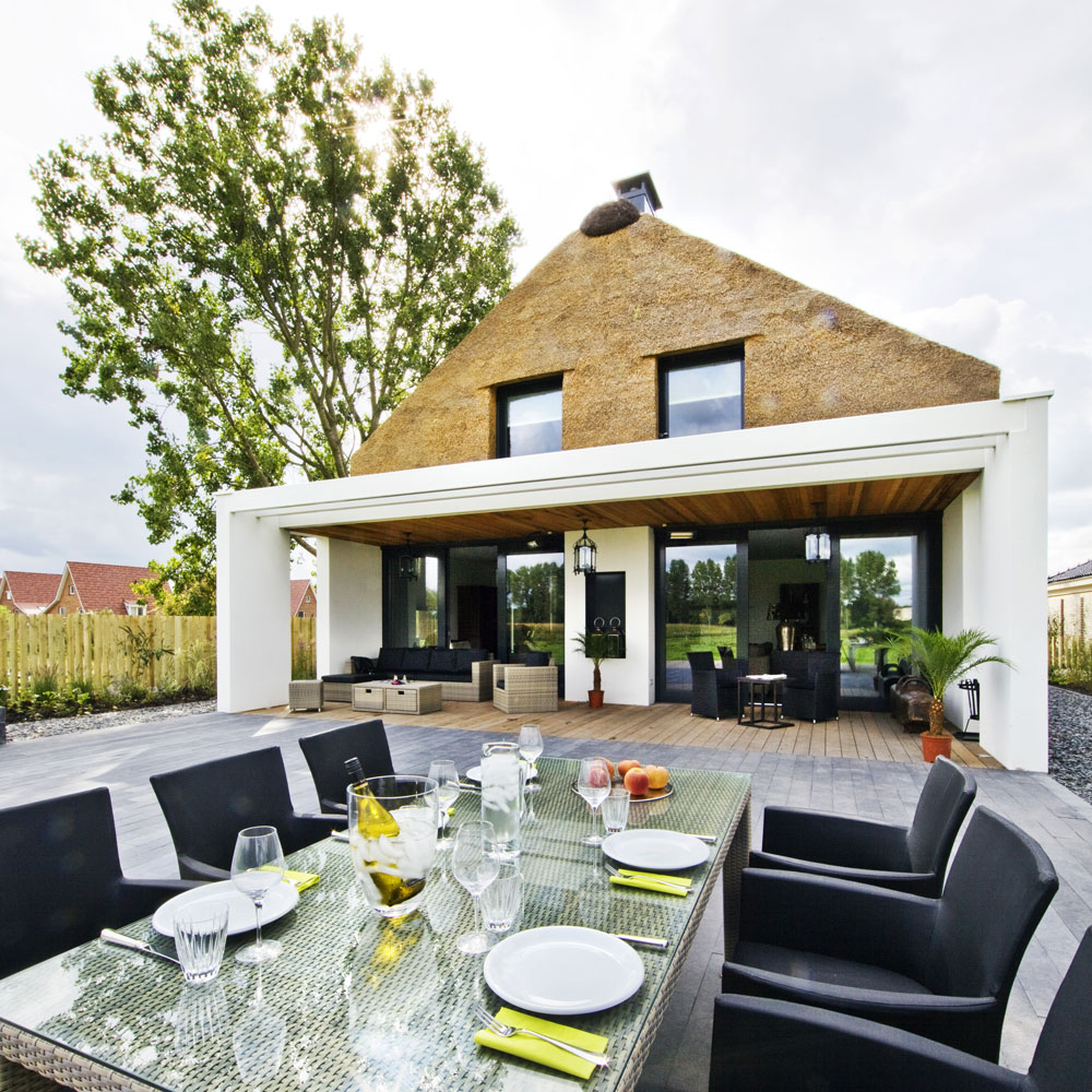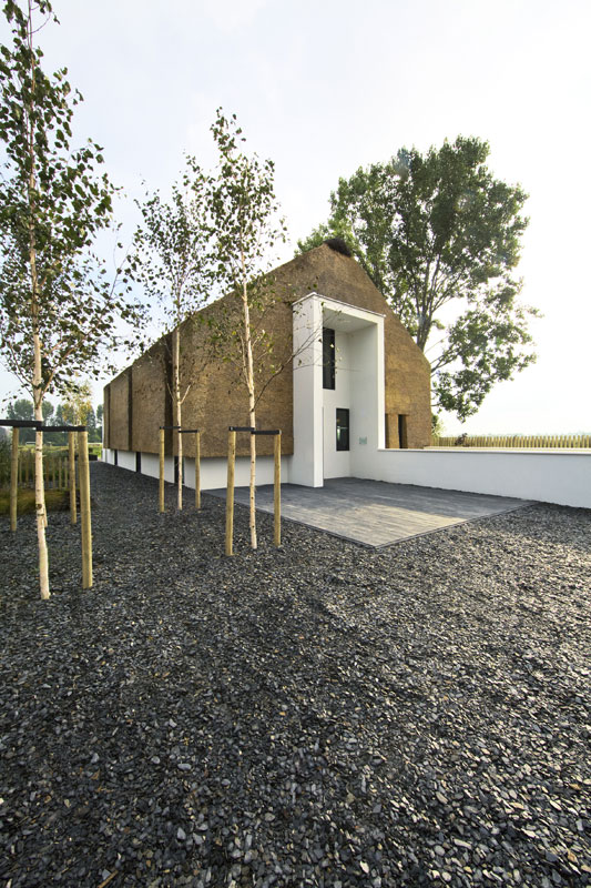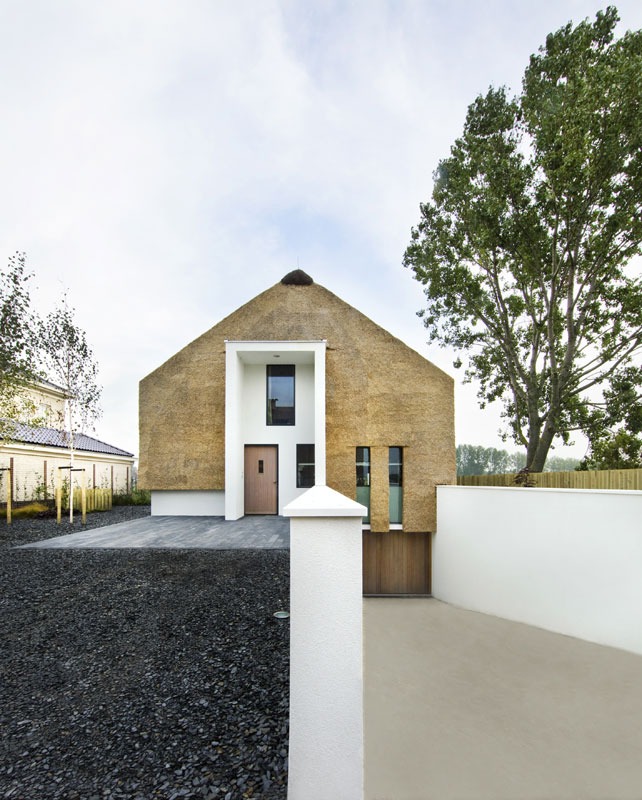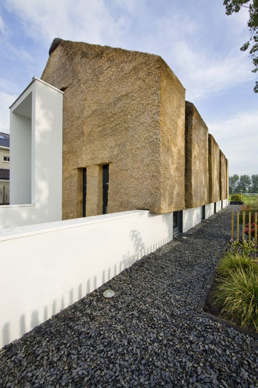 Na prvý pohľad sa tento slamený rodinný dom podobá na luxusné sídlo Petra Kellnera v Podkozí v Berounsku. Český miliardár si však nechal svoj dom obložiť pomerne bežným kameňom, zatiaľ čo tento holandský domček obložil jeho architekt Arjen Reas slamou, ktorá na oči okoloidúcich pôsobí ako magnet. Aj keď ide o rovnako tradičný materiál ako kameň, jej používanie zaznamenalo u nás obrovský útlm a teraz sa do módy vracia s puncom niečoho výnimočného. Použitie slamy na moderný dom, ktorý rešpektuje miestne tradície a prírodu, sa javí ako úplne logické.Pôsobivý moderný vzhľad domu vznikol vďaka kombinácii kompaktného slameného obloženia s hladkou bielou omietkou. Tento princíp spojenia prírodných materiálov s jednoduchou omietkou sa opakuje aj v interiéri. Pri projektovaní bol kľúčový výhľad na okolitú krajinu. Podarilo sa ho zaistiť v každej obytnej izbe, a to vďaka špecifickému riešeniu okien, ktoré privádzajú svetlo hlboko do dispozície domu a v priebehu dňa ním dynamicky menia interiér.