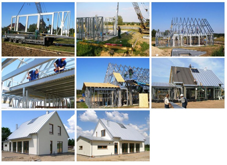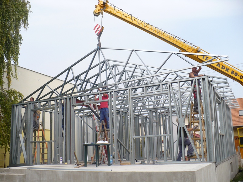 Nakoľko sú jednotlivé profily vyrábané v presných dĺžkach, v závislosti od rozmerov stavby, nie je potrebné diely nijak upravovať či skracovať, čím ušetríte čas pri montáži. Prvá fáza predstavuje montáž jednotlivých blokov – hlavnej nosnej konštrukcie, obvodových a interiérových stien, ktoré sú kotvené do základovej dosky. Nasleduje montáž krovu, ktorý je rovnako ako aj steny predmontovaný do blokov a následne uchytený do obvodových stien. Takto je pripravený oceľový skelet domu pred jeho ďalšou fázou, kým nadobudne finálnu podobu.