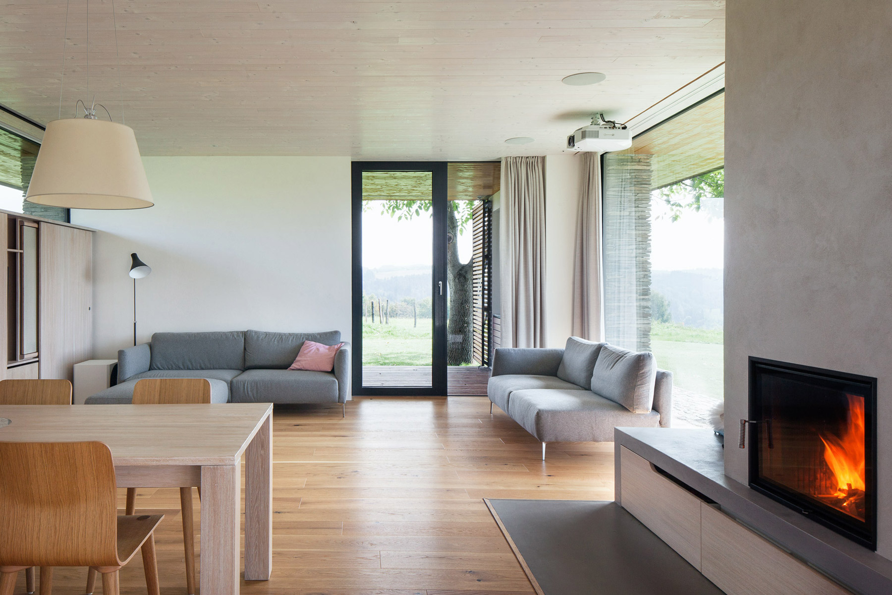 Dominantou tohto spoločenského priestoru je veľký stôl, nechýba kozub na drevo a dve pohovky. Nezvyčajným riešením je umiestnenie zaveseného projektora namiesto televízora, ktorý je ukrytý v skrini. V strope sú osadené dva stereo reproduktory. Zadná časť domu skrýva domáce wellness v podobe priestrannej sauny s vaňou a sprchou.