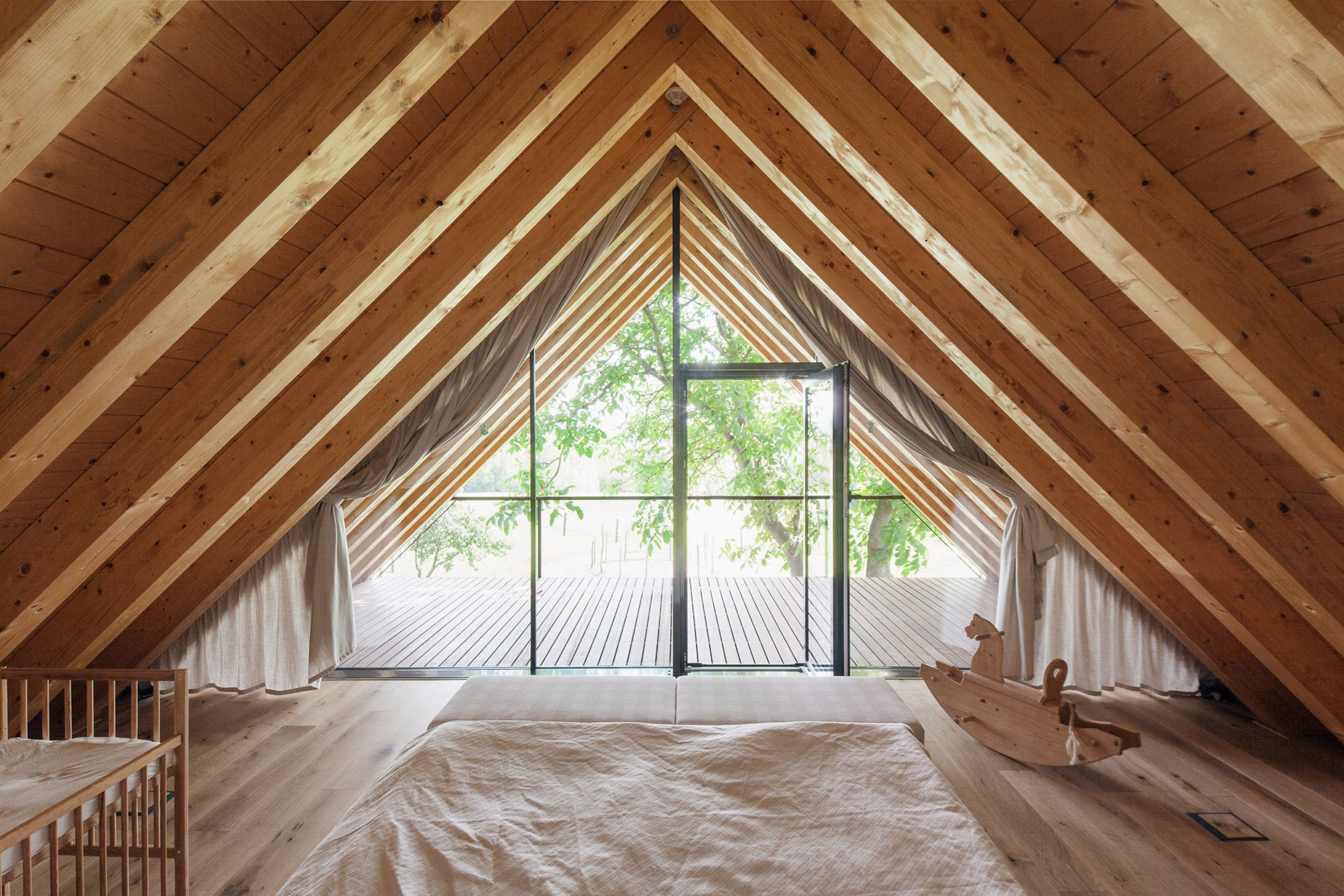 Druhé podlažie domu, teda podkrovie, má rovnakú úžitkovú plochu ako prvé, ale úplne iné určenie. Využitie tejto plochy do istej miery obmedzuje sedlová strecha, je tu však všetko potrebné – dve pohodlné spálne a kúpeľňa. Z jednej zo spální sa dá vyjsť na veľký balkón. Dom pôsobí veľmi esteticky a harmonicky nielen zásluhou použitých materiálov, ale aj vďaka výberu farieb.