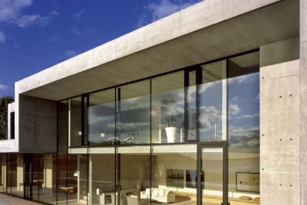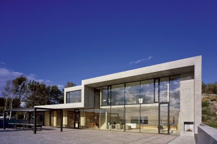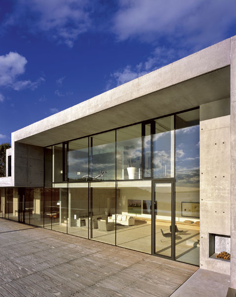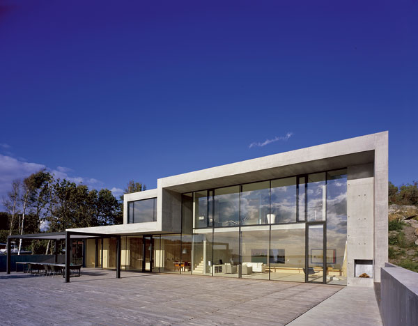 Keďže zadná vrstva vytvára rovinu fasády, vzniklo zastrešenie nad obytným priestorom a jednou zo spální na poschodí. Architekt ponúkal aj ďalšie možnosti zaclonenia fasády, majiteľ však odmietal komplikácie. Dosiaľ býval so ženou v úzkostlivo udržiavanom prostredí starej architektúry. Obom sa žiadala radikálna zmena, teda čo najjednoduchšie, čisté tvary, betón. Pravdepodobne pre maximálnu tvarovú redukciu tento dom švédskeho architekta výnimočne nie je vložený do terénu – v iných domoch krásna skala ozdobuje interiér.