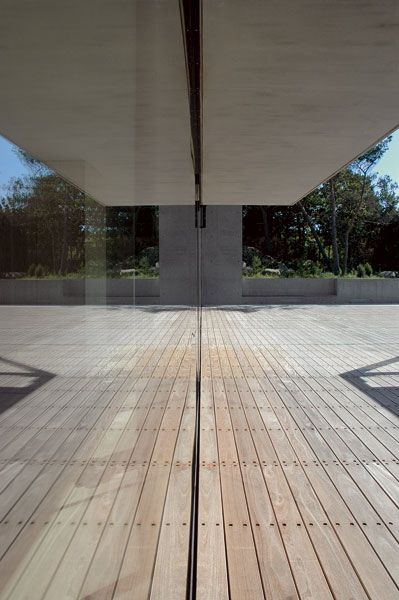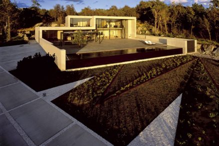 Areál sa končí spomínanou betónovou nádržou z tmavého betónu s prietokovou hranou. Na svahovitom teréne sa cesta dala prikryť plošinou tak, aby z prízemia bolo hneď za terasou vidieť už len more. Za nádržou sa rozprestiera geometrická záhrada s terénnymi vlnami.