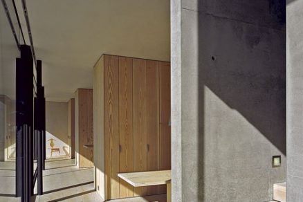 V chodbe je za dverami v múre s podobnou úpravou, akú majú vstavané skrine, skrytá anglická powder room, čiže v podstate väčšia toaleta s veľkým zrkadlom a umývacím priestorom, a vedľa je vstup do práčovne. Na opačnej strane sa nachádza obývací priestor s kláštorne prostým kozubom a lavicou v stene. Tu sú jedinými silnými akcentmi živly: horiace polená a vlny za oknom. Odtiaľ sa výrezom v betóne prechádza k schodisku. Tento detail je skomponovaný tak osobito, že aditívne usporiadanie priestorov za ním nevnímame ako monotónne, ale ako rytmické.
