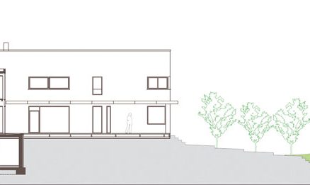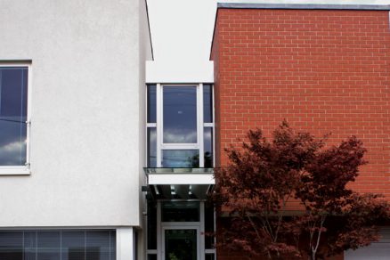 Šikmá strecha vychádza z typických dedinských domov a sleduje archetypálny tvar pultovej strechy, no zároveň projektuje súčasné funkčné i estetické nároky. Zapojenie domu do kontextu sa odráža aj v striedmej farebnosti materiálov na fasáde, ktoré pôsobia cez svoju prirodzenú štruktúru – kombinácia svetlosivej omietky s tmavočervenou obkladovou tehlou Klinker. Tieto dve kontrastné hmoty, vychádzajúce zo základnej koncepcie domu, spája krčok s vystúpenou sklenenou markízou nad vstupnými dverami a súčasne rezonujú so zeleňou sadových a záhradných úprav na pozemku. Harmonizácia s hliníkovými slnolamami a striebornými rámami okien prirodzene dotvára celkový výraz.