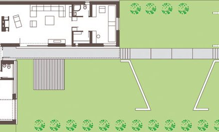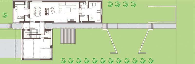 Klasický model vidieckeho urbanizmu sleduje aj pôdorys domu v tvare L. Ten zabezpečuje intimitu obývacej izby a jedálne a súčasne prirodzene komponuje terasu so záhradou. Aký je teda výsledný dojem exteriéru? „Je to taká symetria v jemnej asymetrii,“ odpovedá Mária Bogárová a jedným dychom zdôrazňuje prítomnosť osvietených investorov, ktorí popri prezentovaní vlastných potrieb nechali architektom voľnú ruku. A tí ju nezneužili.