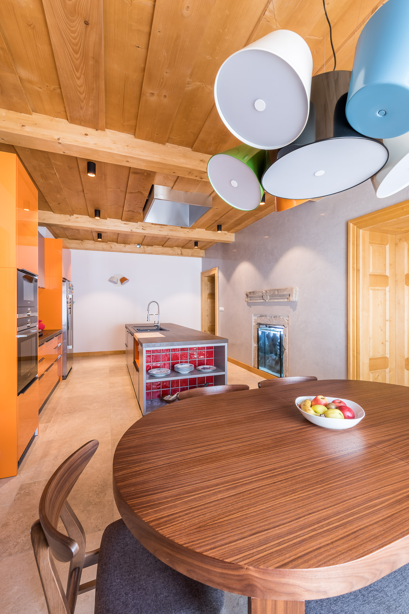 Na vstupnú halu nadväzuje kuchyňa, oproti sa nachádza nové drevené schodisko vedúce do podkrovia, naľavo je vstup do obývacieho priestoru. Kuchyňa je spojená s jedálňou.