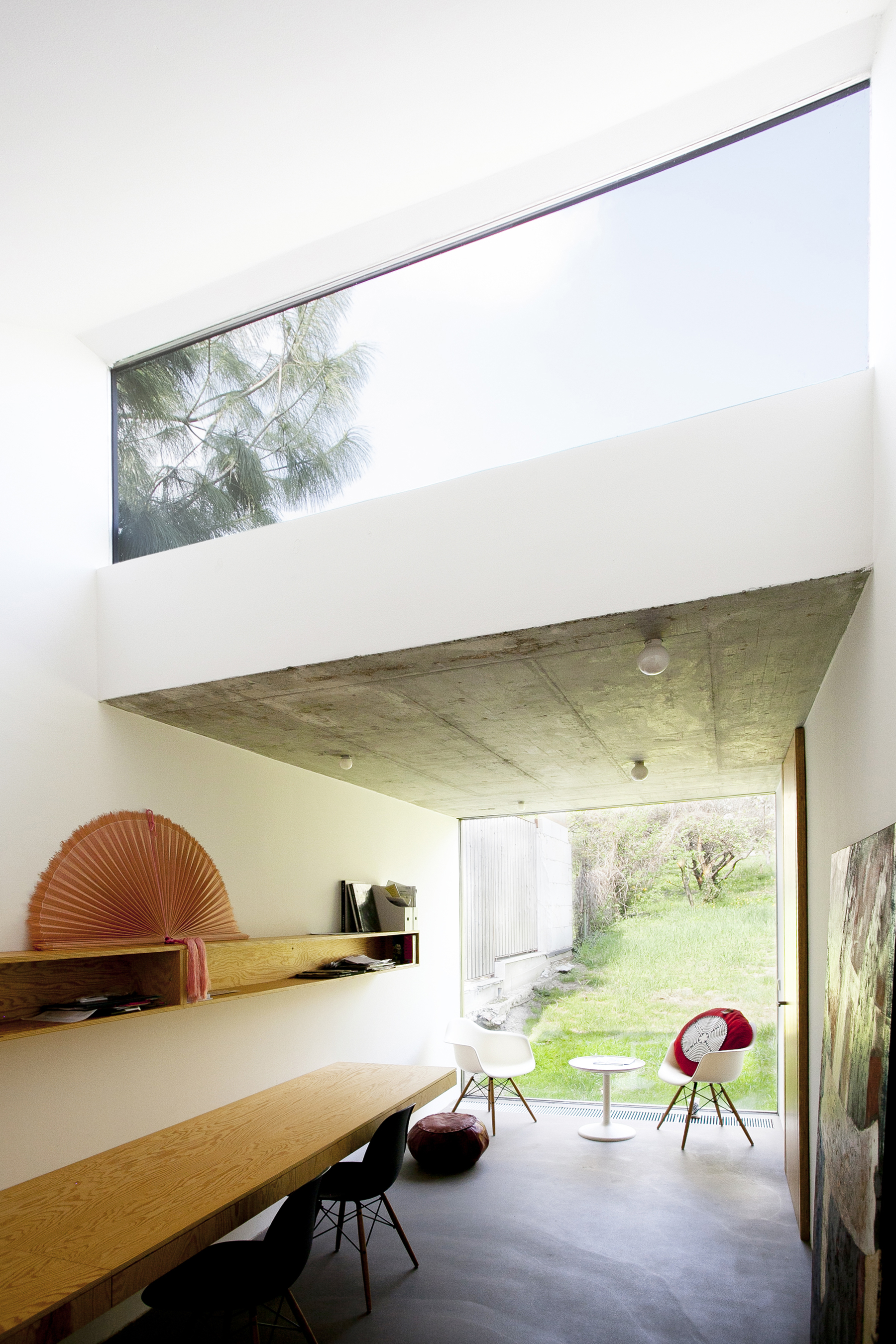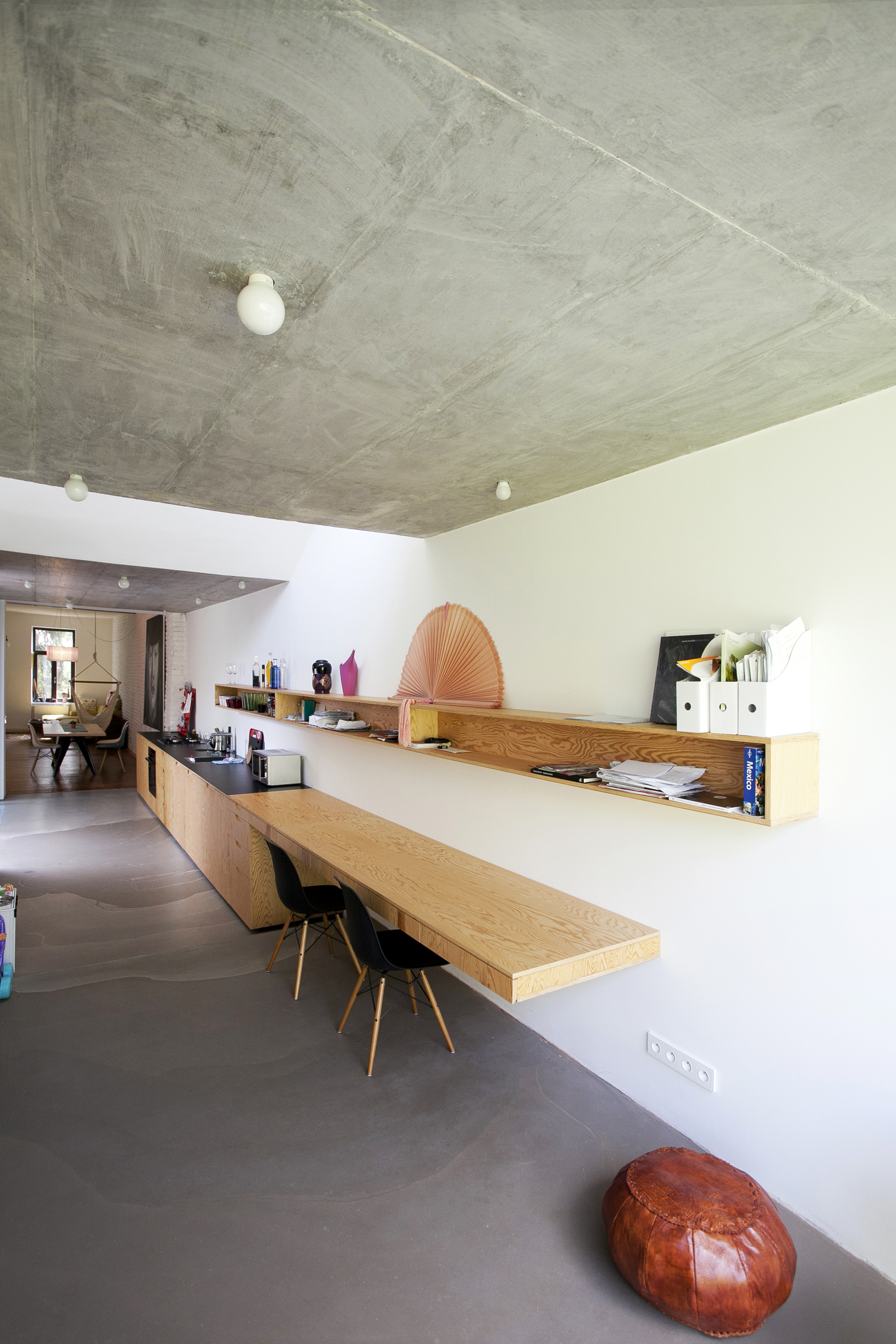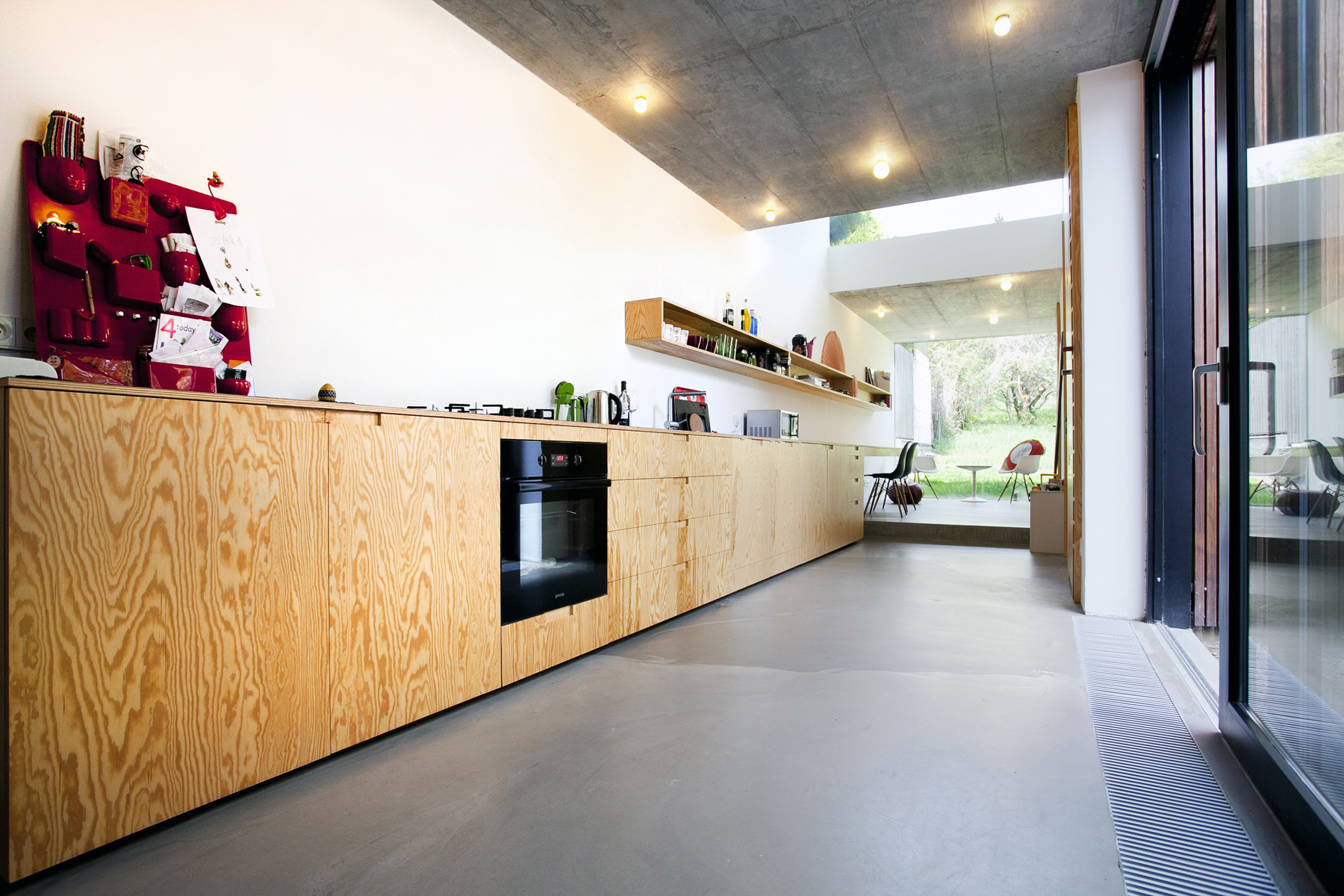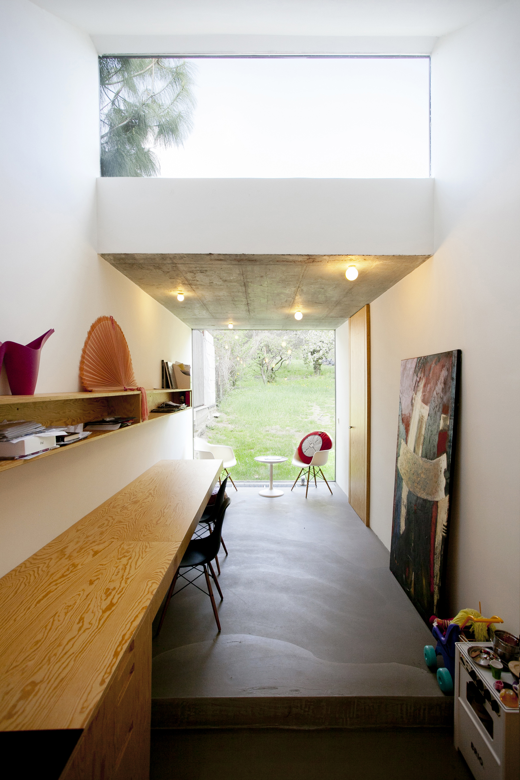 Jednoduchá murovaná prístavba domu s priznaným železobetónovým stropom a pôdorysom v tvare obráteného písmena L zahŕňa kuchyňu (všimnite si zaujímavo riešenú dlhú kuchynskú linku), ktorá je súčasťou už spomínanej spojenej spoločenskej časti zo starého domu. Nadväzuje na ňu menšia pracovňa s kútikom na hranie detí a bezrámovým zasklením.