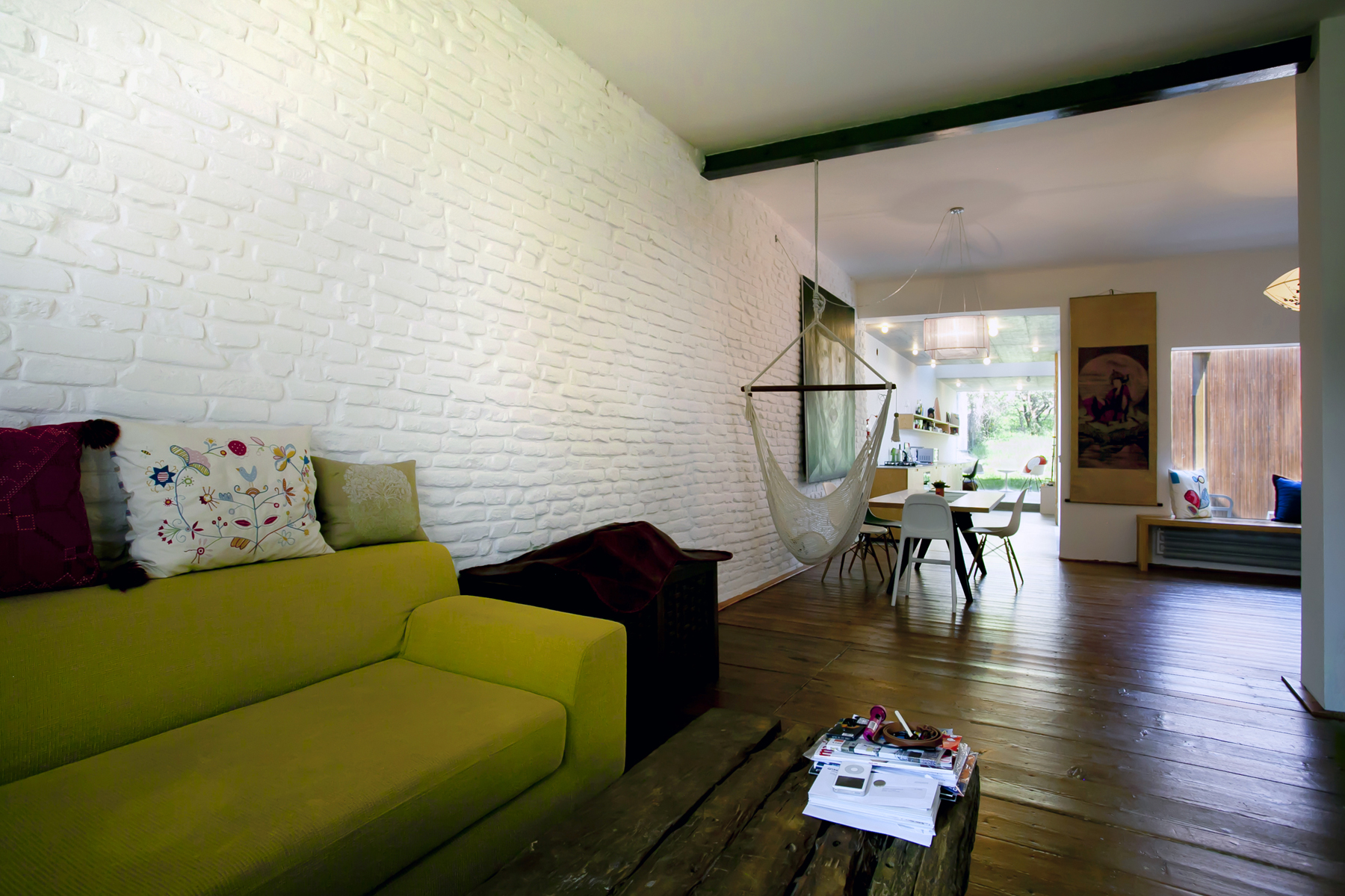 Napriek rekonštrukcii a prístavbe celý interiér stále dýcha minulosťou – nájdete v ňom prvky pripomínajúce históriu a pôvodný dom nesie stále svoju neopakovateľnú charizmu, ako aj nános spomienok. Žili tu totiž starí rodičia dnešného majiteľa. Zaujímavými modernými prvkami sú betónový strop prístavby a tehlová stena pôvodného domu natretá na bielo. Dramaticky na tomto mieste pôsobí aj výrazný obraz. V pôvodnom dome zostala stará dubová podlaha, repasovali krídla dverí a osadili ich do nových bielych zárubní, zachovaný starý nábytok bol doplnený moderným, najmä vstavaným. V prístavbe je liata podlaha.