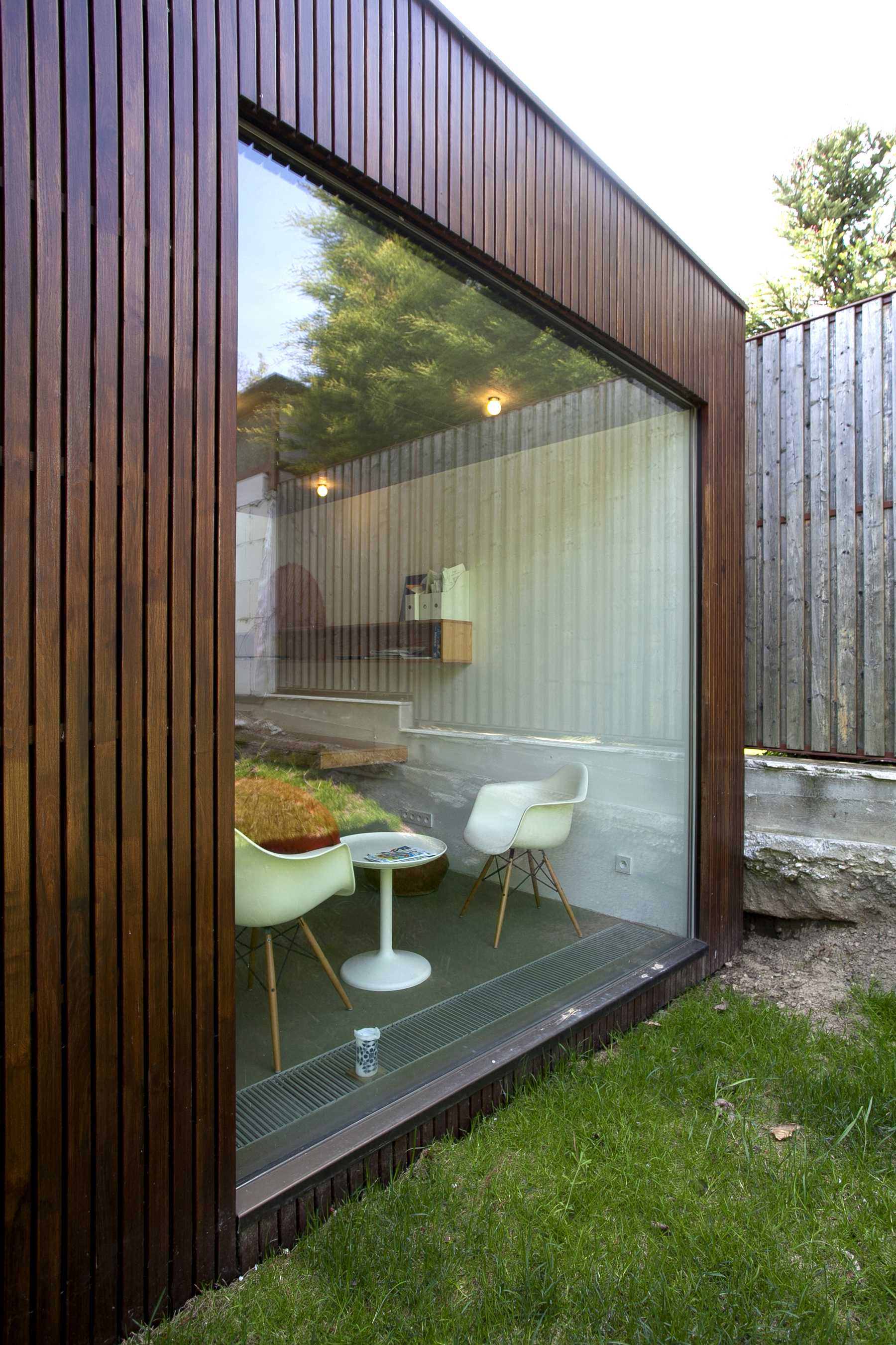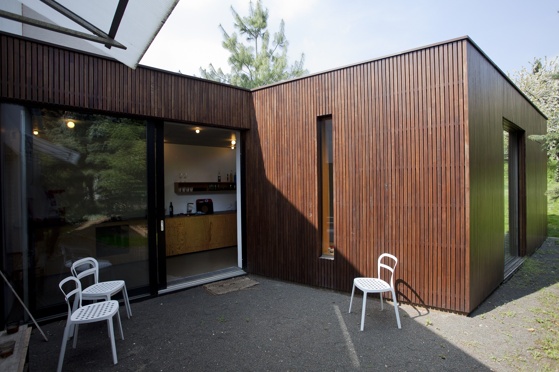 Pôvodná záhrada zostala nedotknutá a vytvára súkromie v exteriéri. Odrastené stromy chránia pred zrakmi susedov a izolujú domácich do vlastného veľmi príjemného mikrosveta. Prístavba stojí na mieste niekdajšieho hospodárskeho traktu a je rovnako dlhá, ako bol on. Zeleň rastie aj na fasáde – zadná fasáda domu postupne obrastá popínavým viničom.