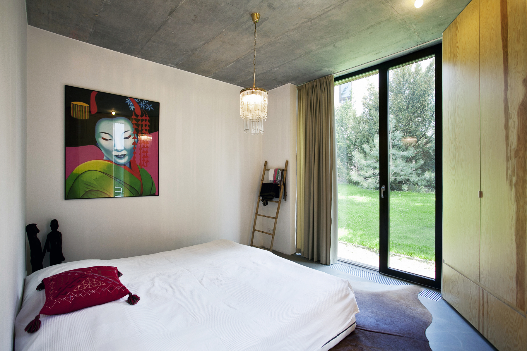 Zo základnej hmoty smerom do záhrady vyčnieva príjemná rodičovská spálňa. Vystúpením do súkromia pozemku zároveň vytvára átrium, do ktorého je priamy vstup z kuchyne. Zo všetkých miestností novej časti orientovaných do záhrady je výhľad na prírodu vďaka veľkým zaskleným plochám, zo spálne je možné vyjsť priamo do záhrady.