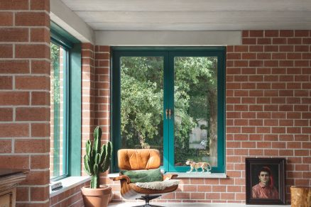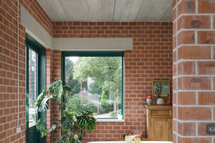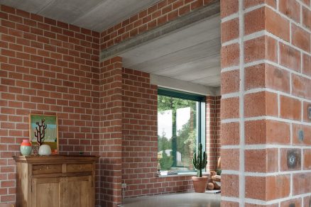 Okná domu sú umiestnené blízko rohov, čo umožňuje diagonálne výhľady naprieč domom. Keď vstúpime do domu, červené tehly rovnakých rozmerov ako na fasáde pokračujú aj vo vnútri, podčiarkujúc tak masívny charakter stien. Priznaním stavebných materiálov sa výrazne zvýšili nároky na realizáciu – žiadna realizačná chyba sa nedala dodatočne schovať.
