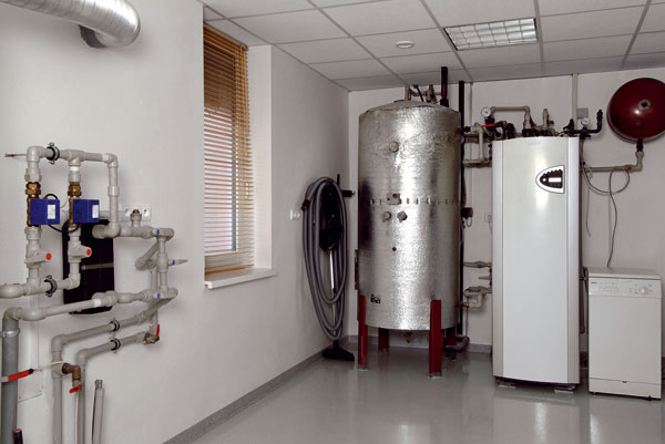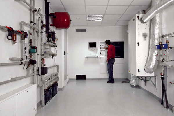 | V technologickej miestnosti na prízemí je ovládanie inteligentnej elektroinštalácie aj riadiaca jednotka pre vykurovací systém. Zdrojom tepla sú jednak slnečné kolektory, jednak tepelné čerpadlo zem – voda. Čerpadlo odoberá teplo zo studne s celoročnou teplotou okolo 10 °C alebo zo zeme pod domom, ktorá zároveň slúži ako akumulačný zásobník prebytočného tepla zo solárneho zariadenia. Systém sa automaticky prepína podľa momentálnej potreby a situácie. Nielen na priamy odber, ale aj pre podlahové a stropné vykurovanie (stropné sa môže v lete využívať aj na chladenie) sa voda ohrieva v akumulačnej nádrži – kúrenie je tak plynulejšie. Inteligentné systémy v celom dome – od otvárania brány až po internet – možno ovládať pomocou dotykového displeja umiestneného v obývačke. |