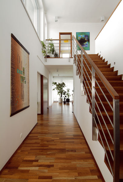 Do domu sa vchádza krátkou chodbičkou, v ktorej si môžete odložiť kabáty: „Vstupné dvere nie sú špeciálne, ale uzatvorená predsieň tvorí chladnú, prechodovú zónu,“ naznačuje hneď na začiatku domáci pán logiku tepelného zónovania domu. Až za druhými dverami sa teda pred návštevníkom otvorí obytný priestor – cez svetlom zaliatu halu s galériou a schodiskom možno vidieť do otvorenej kuchyne a obývačky.