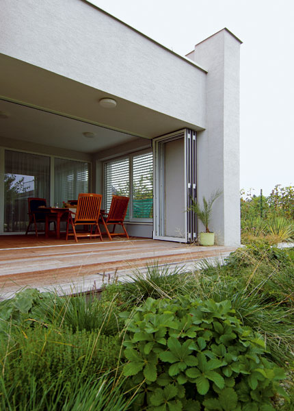 Pre pána Gablasa bol v tomto prípade prvoradý manželkin sen o príjemnom rodinnom bývaní, i keď bol len ťažko zlučiteľný s pasívnou výstavbou. „Posuvné a skladacie zasklené dvere sa reálne nedali zaizolovať a utesniť tak, aby spĺňali požiadavky pasívneho štandardu, takže som sa snažil nájsť nejaké prijateľné riešenie. Terasa, alebo skôr zimná záhrada, preto tvorí akýsi medzipriestor či prechodovú zónu, pokiaľ ide o vykurovanie. Tepelná izolácia sa teda zlepšila tým, že sme pridali ďalšiu bariéru. Predpokladám, že keď bude vonku –10, na terase bude asi +5 °C. Ešte presne neviem, ako sa dom bude správať. Na podobné otázky mi totiž u nás nikto nevedel jednoznačne odpovedať. Jediná možnosť bola vyskúšať to. Už po roku používania som prišiel na veľa vecí, niektoré sa ešte ukážu neskôr.“