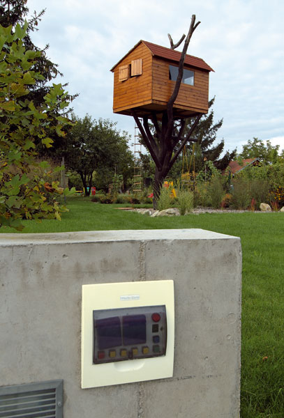Podobné myslenie o krok dopredu uplatnil pán Gablas aj v záhrade: „Pôvodná studňa je pripojená na vodovodnú šachtu, v ktorej sa zbiehajú všetky zdroje vody. Takže sa môžem rozhodnúť, či budem polievať vodou zo studne alebo mestskou vodou, či použijem „šedú vodu“ na splachovanie záchodov a podobne. Teplú vodu z kolektorov môžem v budúcnosti využiť v záhradnej sprche alebo v bazéne – keď bude čas a potreba, môžem ich jednoducho doplniť. Investícia do takejto prípravy je zanedbateľná v porovnaní s tým, čo by ma stálo robiť rozvody dodatočne. Keď už bol trávnik rozkopaný z dôvodu zavlažovania, pridal som len zopár izolovaných hadíc. Nech čakajú, kým príde ich čas.“