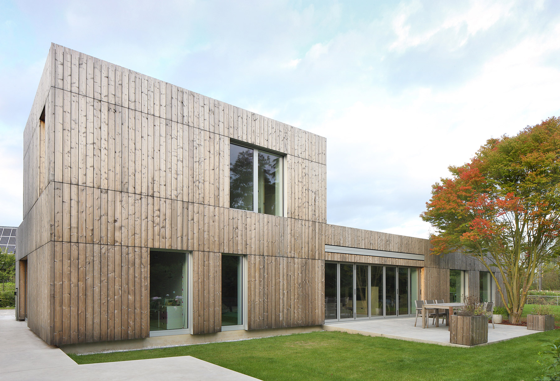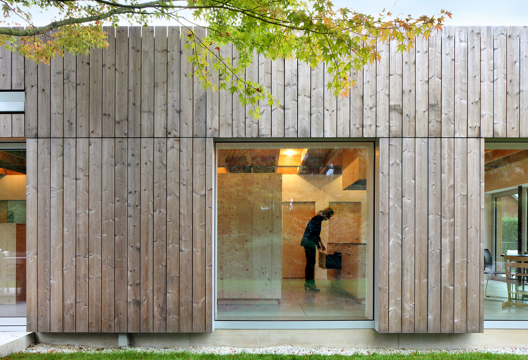 Zvonku je bungalov opatrený izolačným plášťom a pokrytý obkladom z tepelne upraveného dreva. Hlboké okenné šachty s oknami siahajúcimi až po úroveň podlahy sú oproti pôvodnému stavu taktiež prospešnou a estetickou inováciou. Fasáda z termodreva dodáva prerobenému starému bungalovu moderný vzhľad a vekom pracuje – stáva sa jednoduchou sivou. To dodá domu zaujímavý vzhľad i v budúcnosti (rovnako aj v súvislosti s použitými hliníkovými profilmi).