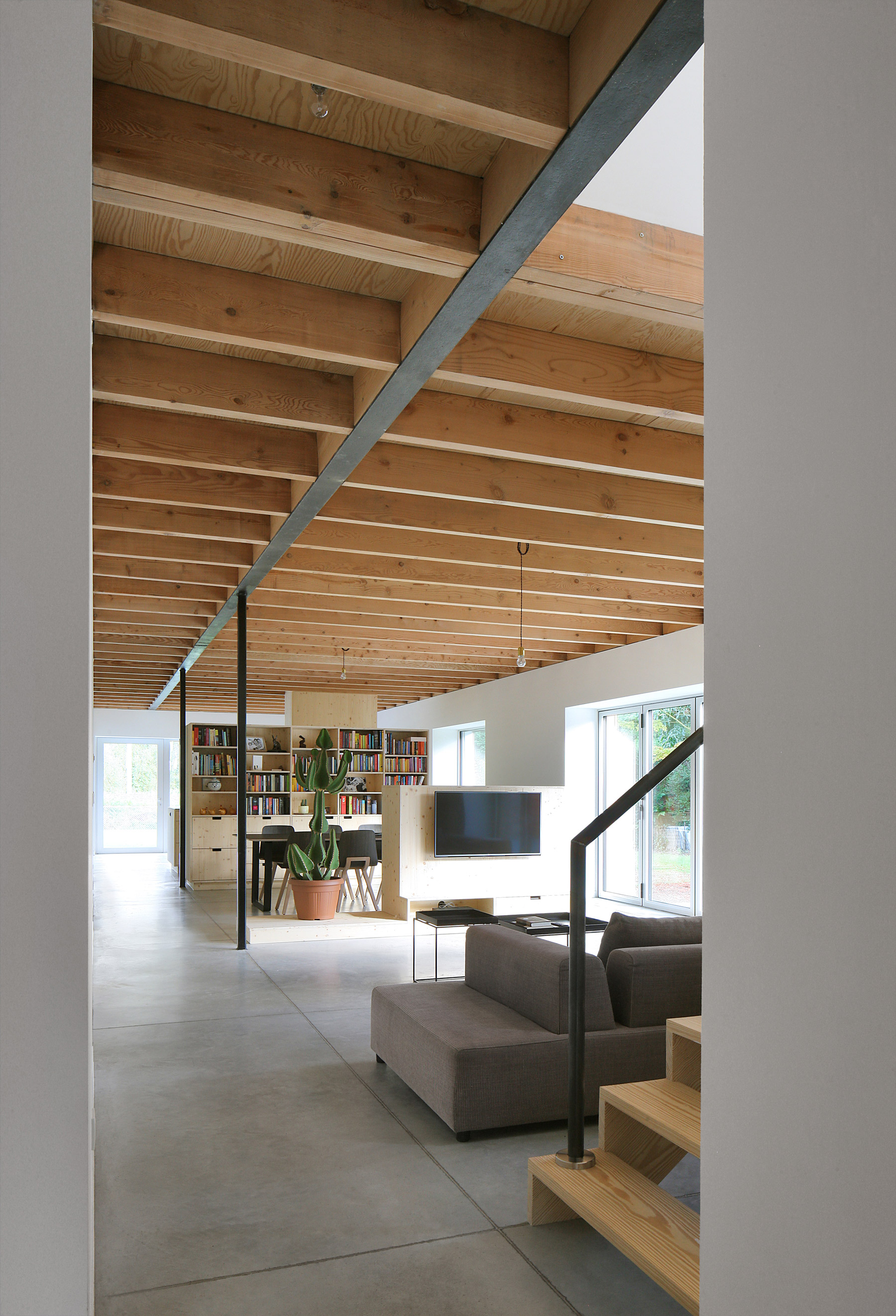 Nemenej dôležitou premenou z hľadiska obytného priestoru prešla bývalá garáž. Architekti v nej vybudovali dve detské izby, ktoré sa otvárajú do herne. Spálne na poschodí prakticky doplnili o kúpeľňu a šatňu. Novovybudovaný priestor pod plochou strechou s viditeľnými trámami dáva interiéru charakter a rytmus.