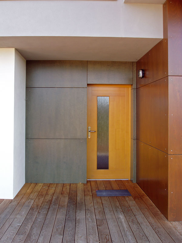 | Hlavný vstup do domu je situovaný približne uprostred dispozície, kolmo na os domu. | Presah striech a terás chráni interiér pred prehriatím – najmä na južnej strane domu. |