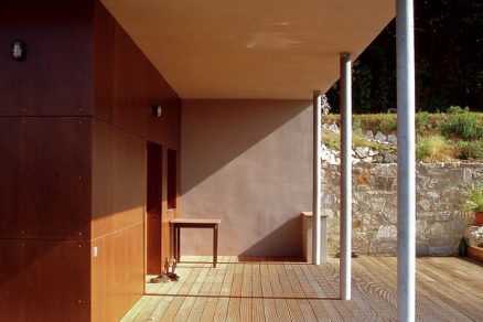 A naopak – vďaka bohato zasklenému priečeliu prízemnej stavby umožňuje prírode „vstupovať“ do interiéru. Úžasný výhľad by bola škoda „zamurovať“, preto sa mu podriadila aj dispozícia – pohľad do diaľky sa dá vďaka zasklenej západnej stene vychutnať vo všetkých obytných miestnostiach interiéru. Spálňová západná stena sa obracia v segmentoch za juhozápadným slnkom a vytvára tak jednotlivým izbám určitú intimitu.