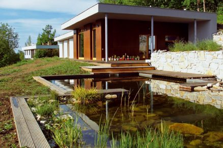 Južné a západné presahy striech a terasy chránia interiéry pred letným prehrievaním a súčasne dovoľujú príjem tepelných ziskov počas slnečných dní zimných mesiacov. Vďaka tomuto riešeniu stavba pri pohľade od zadnej – východnej časti doslova splýva s terénom. Prírodné prostredie v bezprostrednom okolí dopĺňa dvojstupňové jazierko s atribútmi koreňovej čistiarne a s možnosťou kúpania v jeho hlbšej časti.
